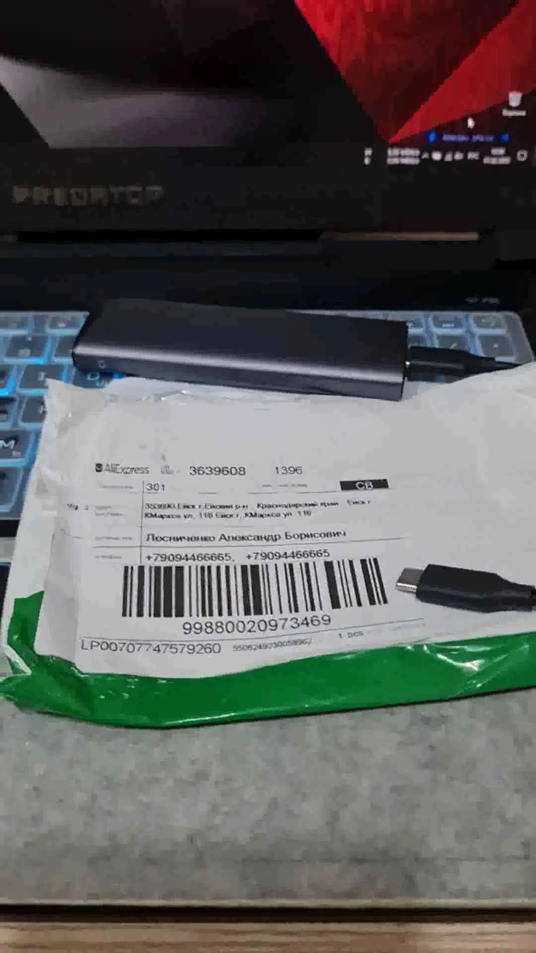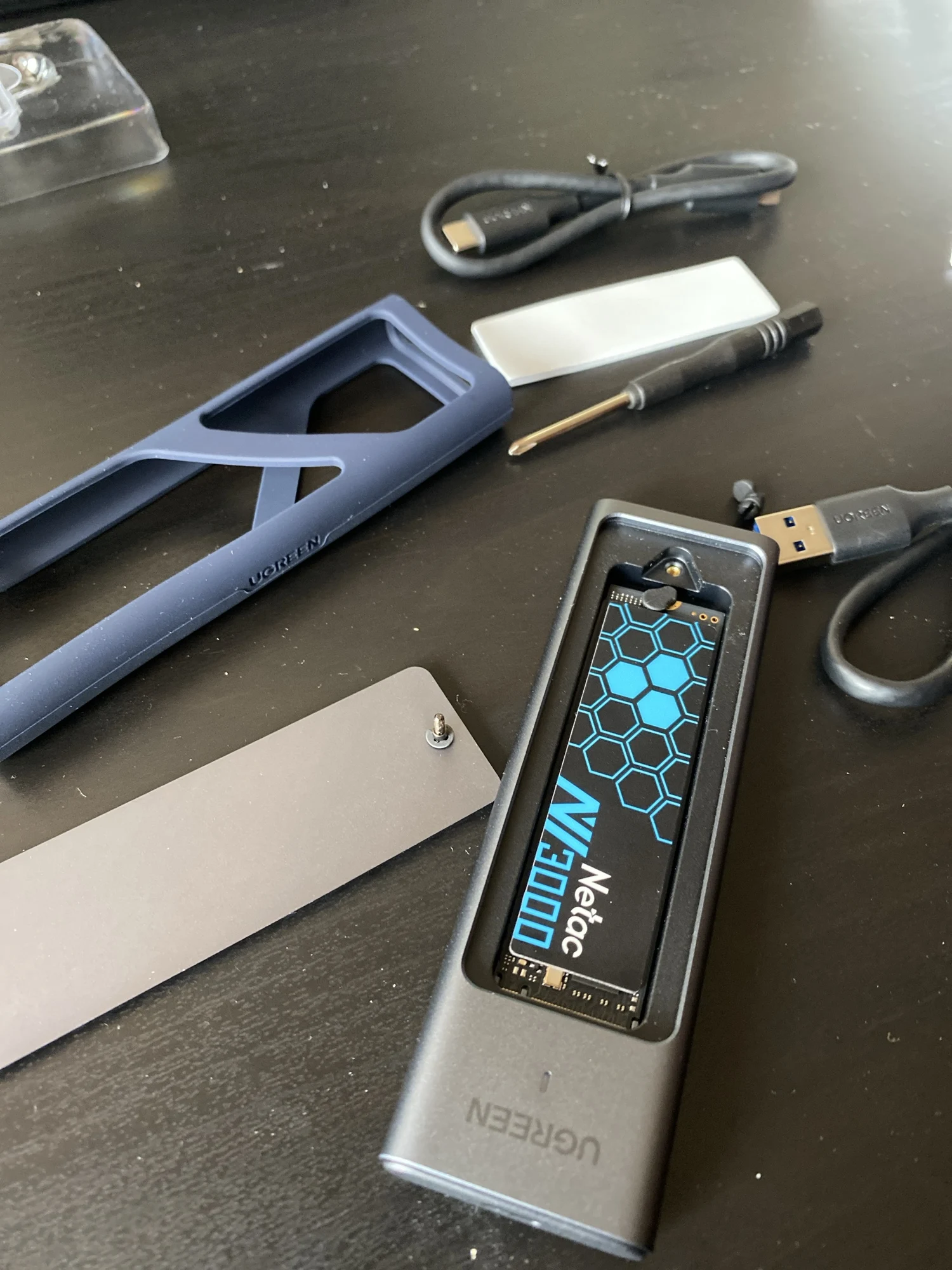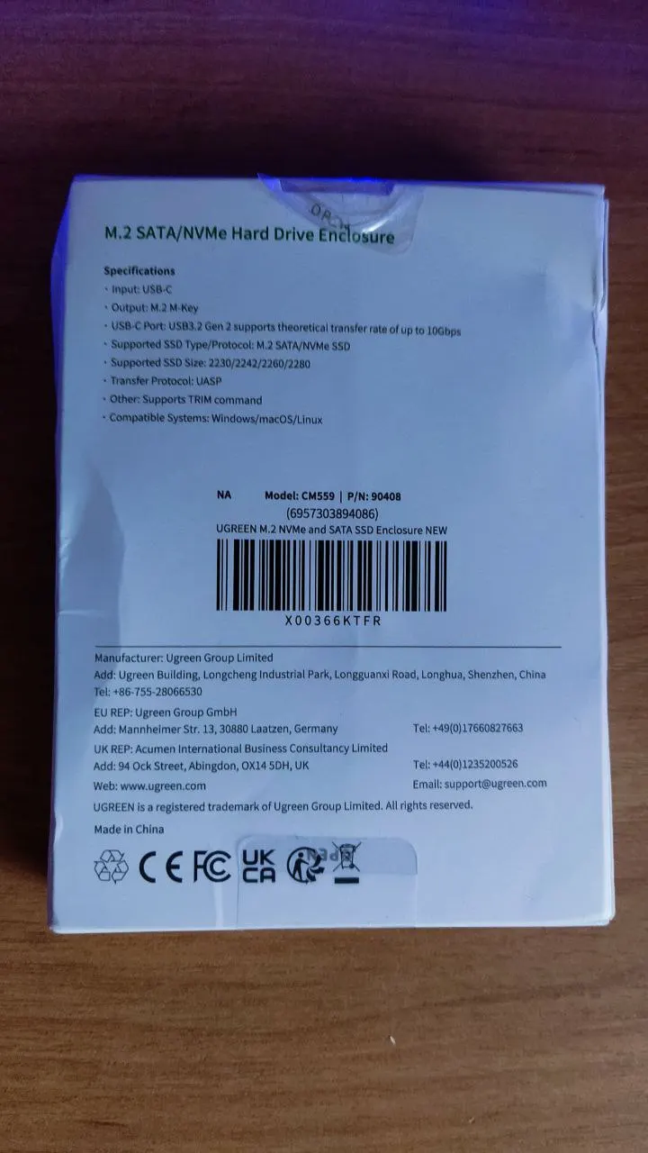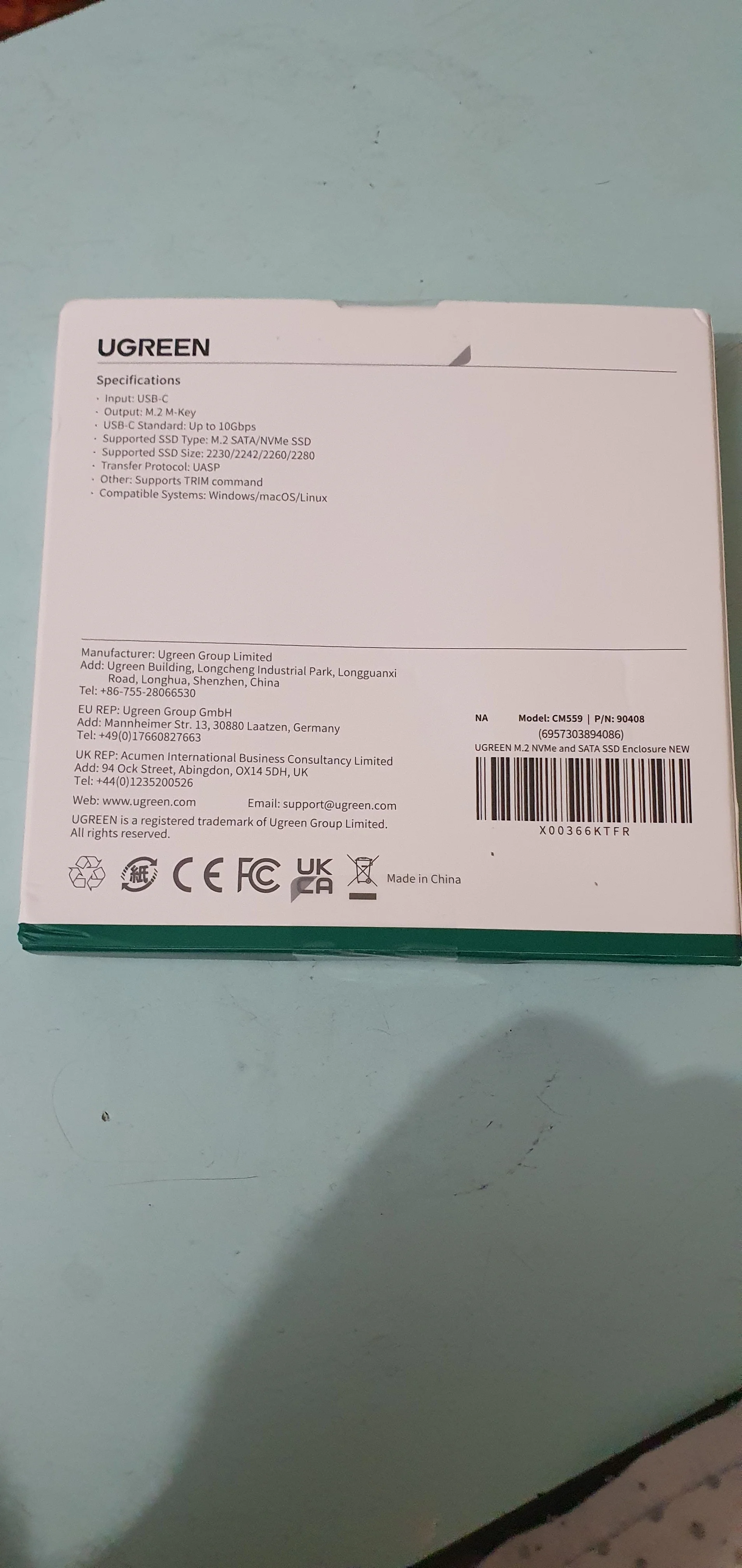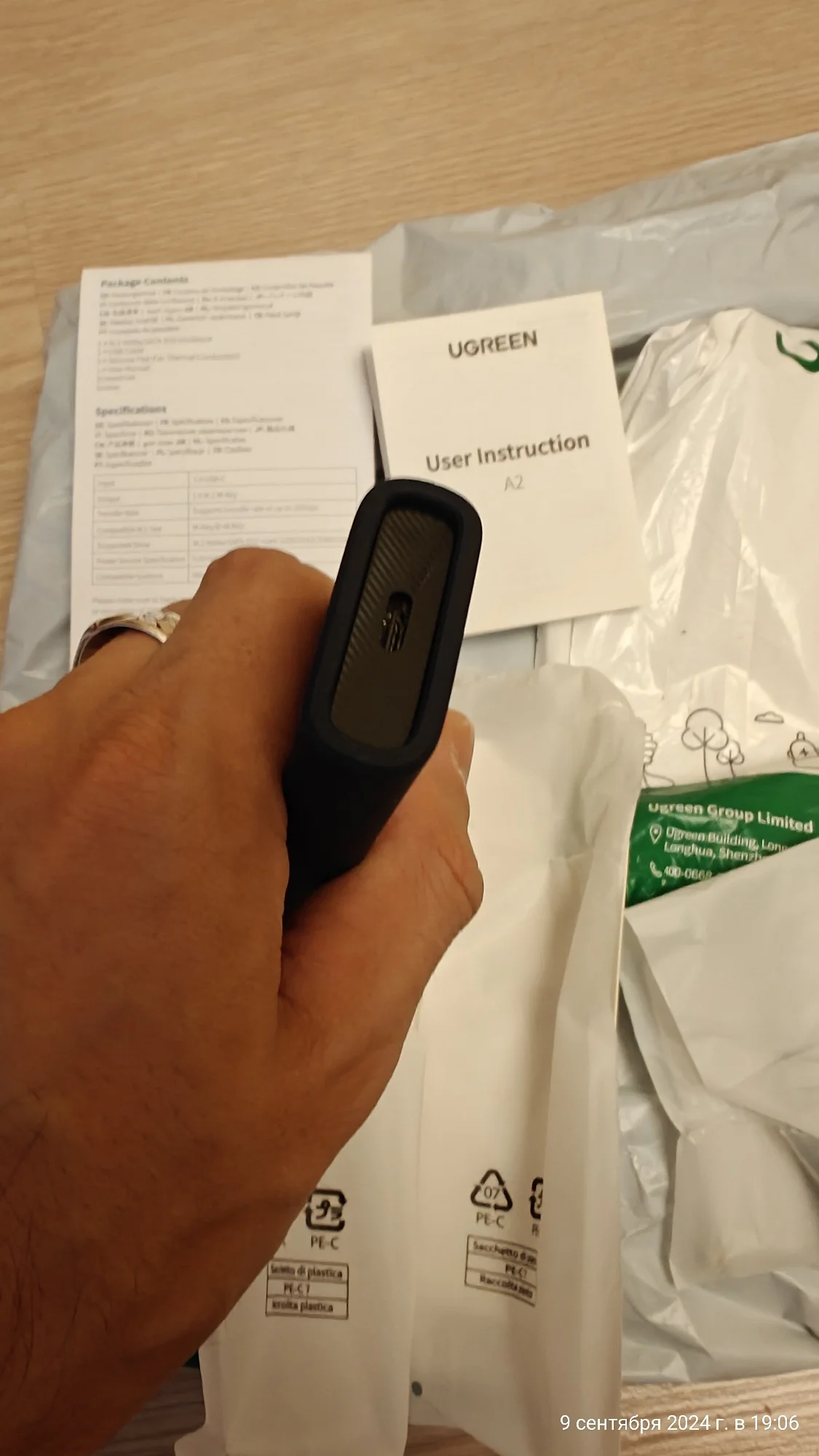 Доставка заняла два месяца. Но это вина Почты России !!! Задержали посылку в пром. центре на 20 дней !!! Думал уже что моя посылка утеряна. Но чудо, она наконец дошла до меня!!! Качество Ugreen, как всегда, на хорошем уровне. Оригинальный дизайн, очень приятно пользоваться. В руке лежит удобно. Без преувеличения, ощущение премиальный вещи. Силиконовый чехол так же хорошего качества, плотно облегает корпус и не болтается, но очень сильно притягивает на себя пыль ) . Корпус полностью из алюминия, выполнен очень качественно. В комплекте тесть всё, термо-прокладка, которая отводит тепло на рифлёную крышку отсека и охлаждает ssd, отвёртка, запасной резиновый держатель ssd и 2 кабеля (Type-C с обоих сторон) и (Type-C-> USB 3.0(A). Досталась мне за 1400 руб. Отличная вещь от Ugreen, рекомендую к покупке !!!