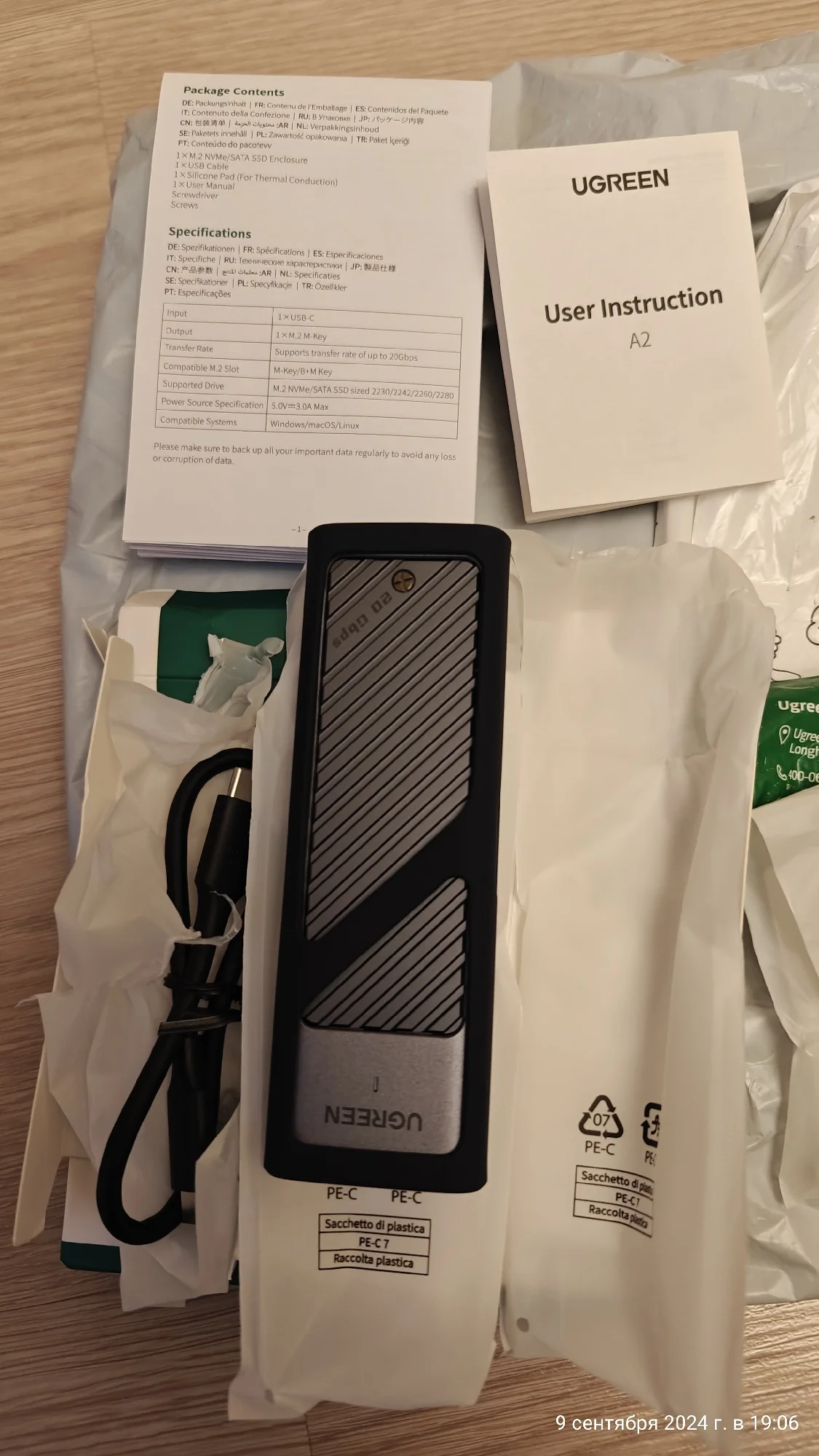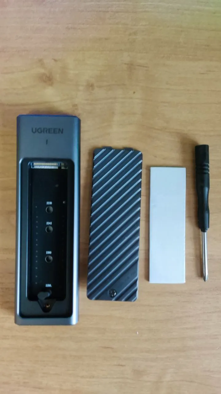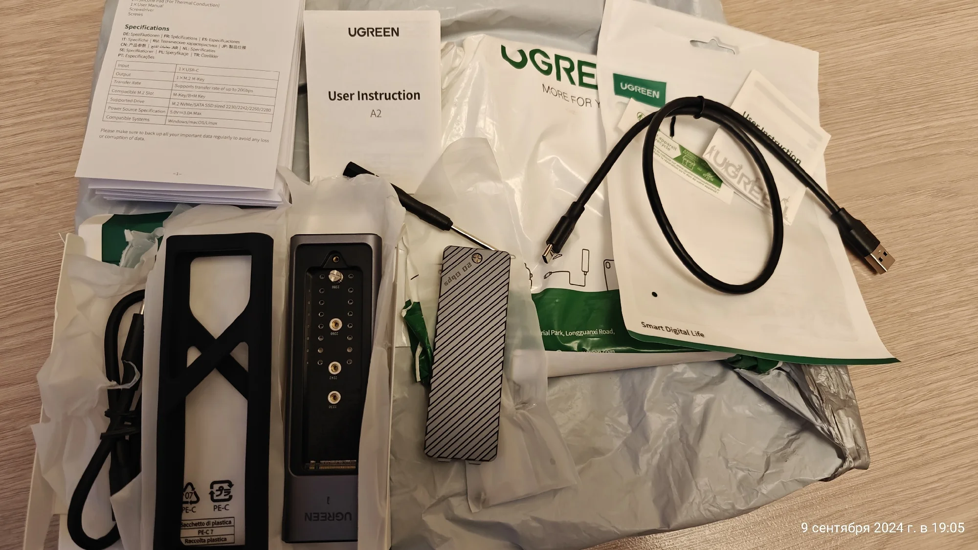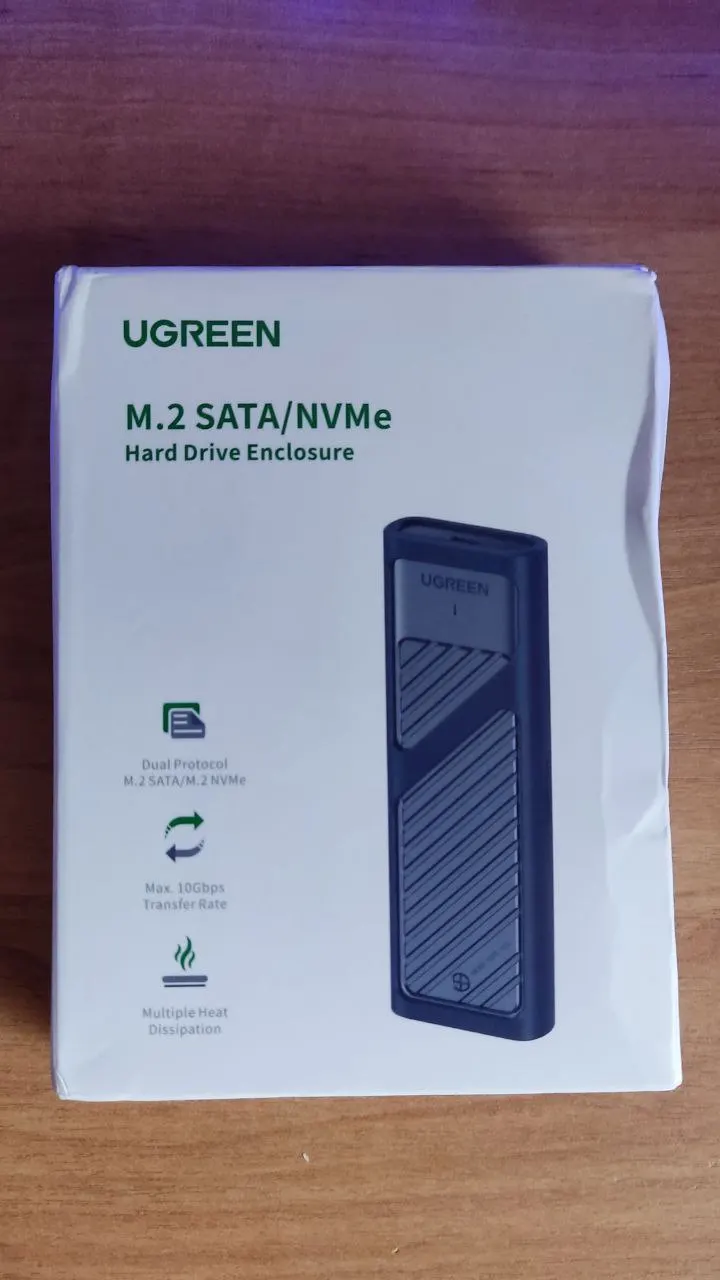 Товар полностью соответствует описанию у продавца! Великолепная комплектация, куда входит всё необходимое для монтажа M.2 SSD и сами материалы кейса и медная пластина для отвода тепла. Так же наличие комплектного, прорезиненного бампера для транспортировки. Плюс быстрая доставка за три дня. Как и всегда рекомендую продукцию UGREEN к покупке 👌🏻