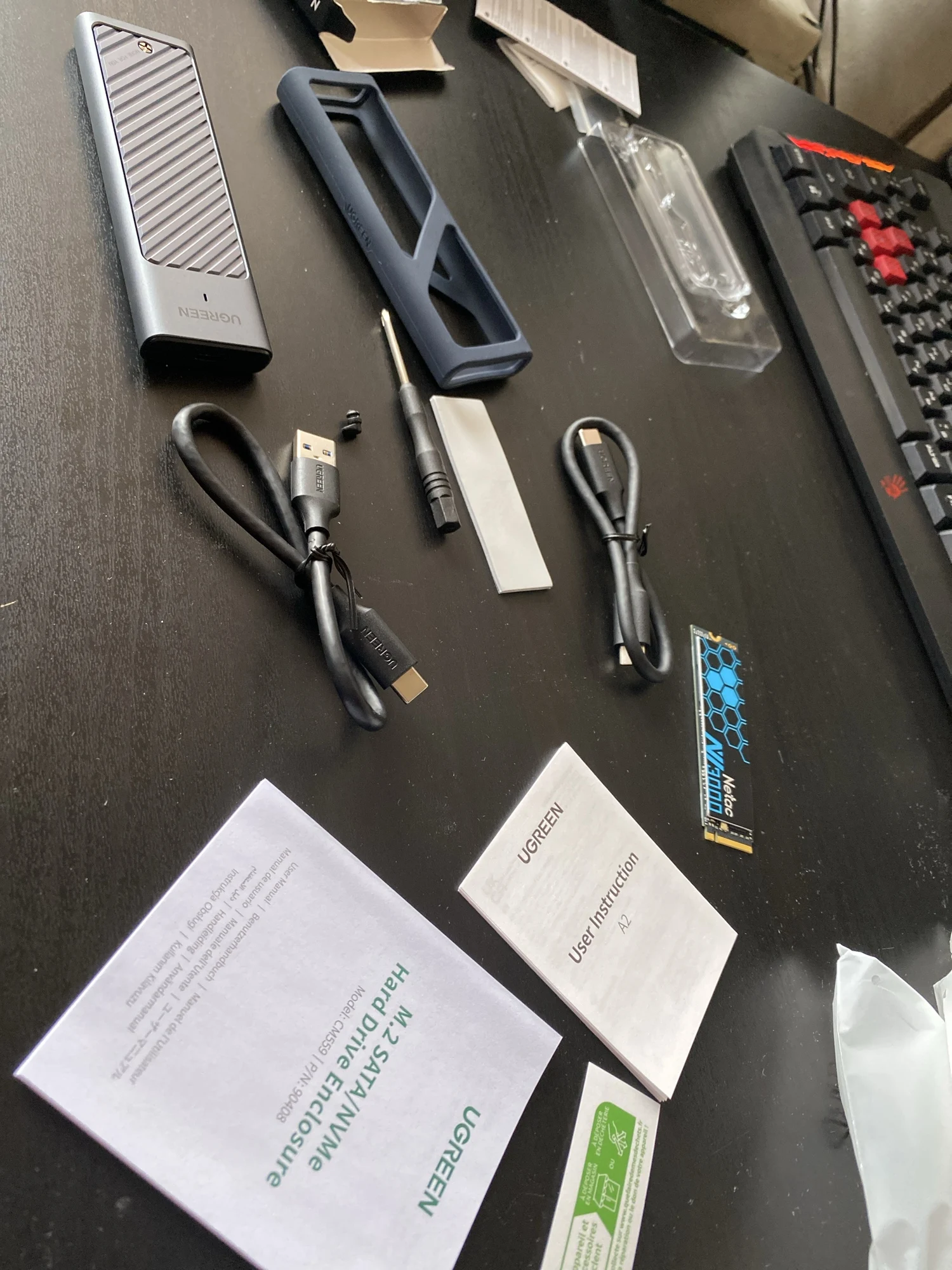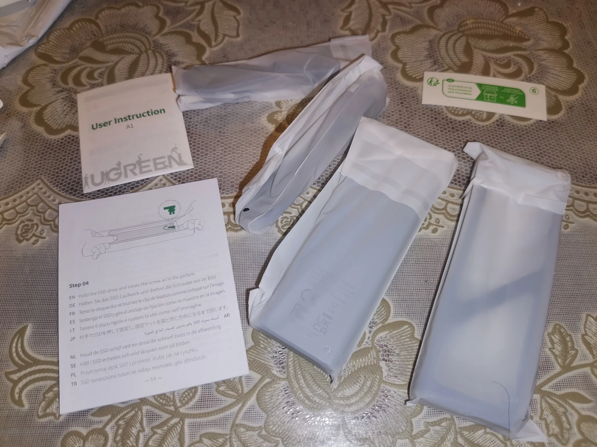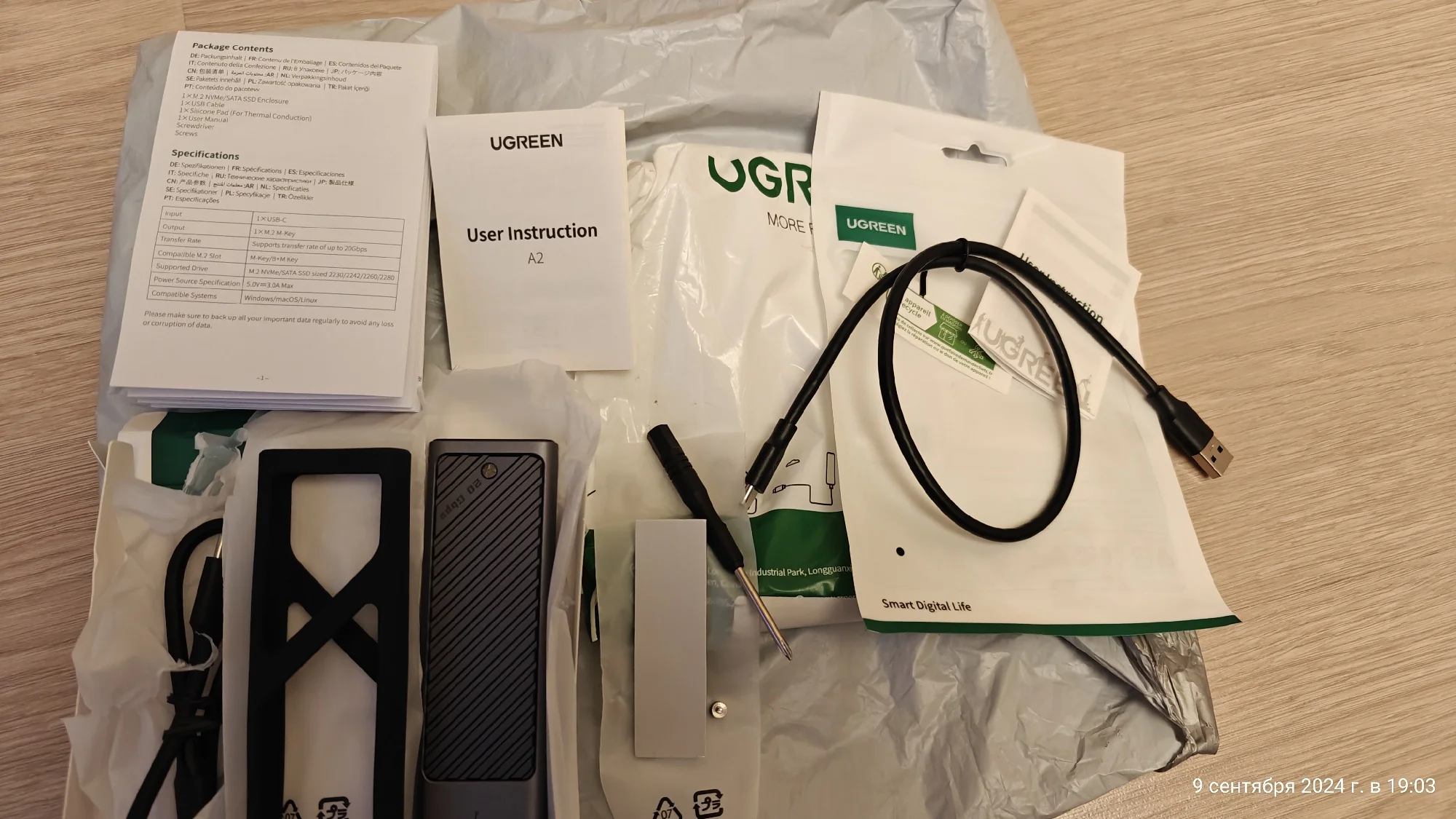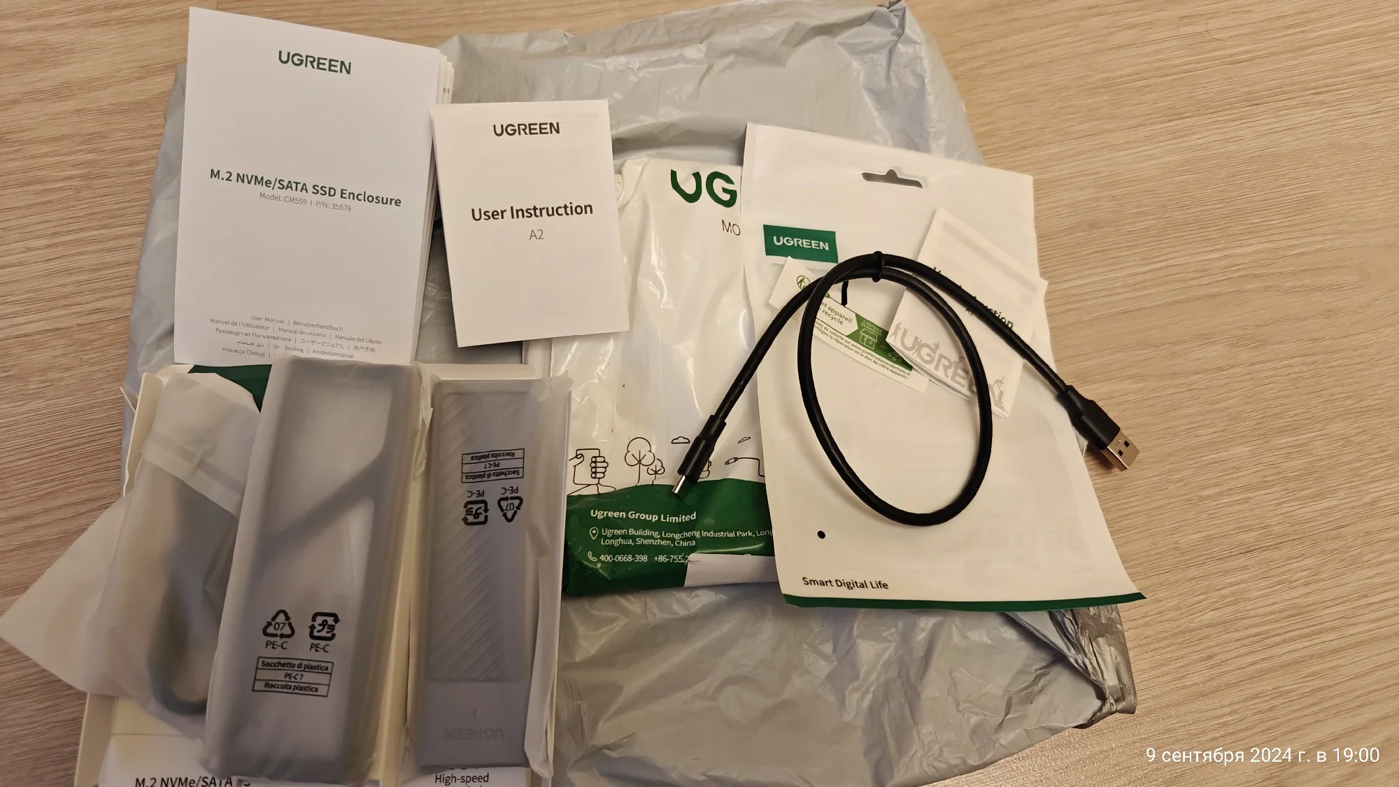 Товар полностью соответствует описанию у продавца! Великолепная комплектация, куда входит всё необходимое для монтажа M.2 SSD и сами материалы кейса и медная пластина для отвода тепла. Так же наличие комплектного, прорезиненного бампера для транспортировки. Плюс быстрая доставка за три дня. Как и всегда рекомендую продукцию UGREEN к покупке 👌🏻