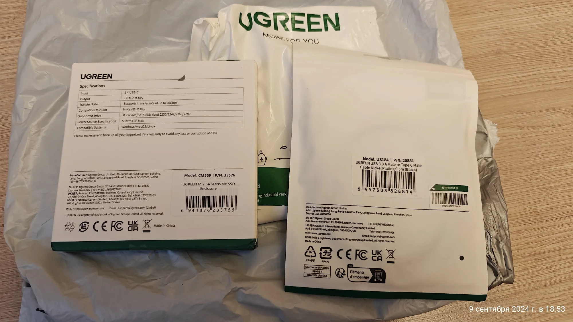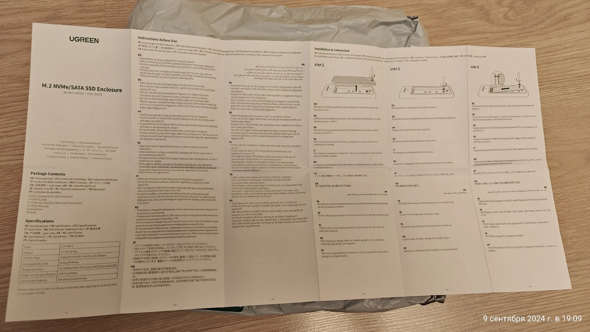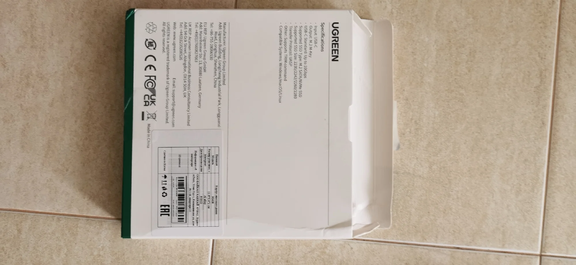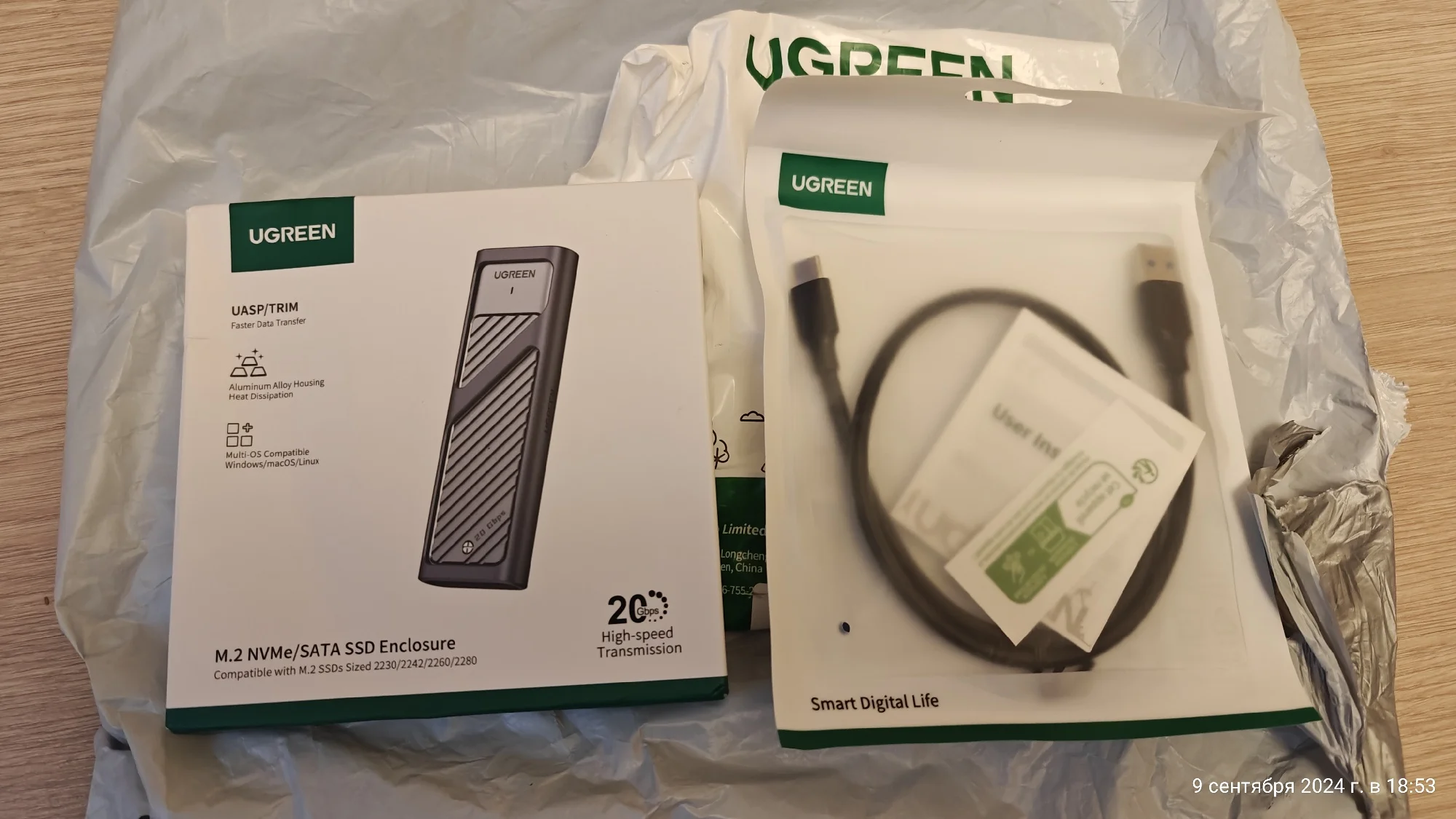 Товар полностью соответствует описанию у продавца! Великолепная комплектация, куда входит всё необходимое для монтажа M.2 SSD и сами материалы кейса и медная пластина для отвода тепла. Так же наличие комплектного, прорезиненного бампера для транспортировки. Плюс быстрая доставка за три дня. Как и всегда рекомендую продукцию UGREEN к покупке 👌🏻