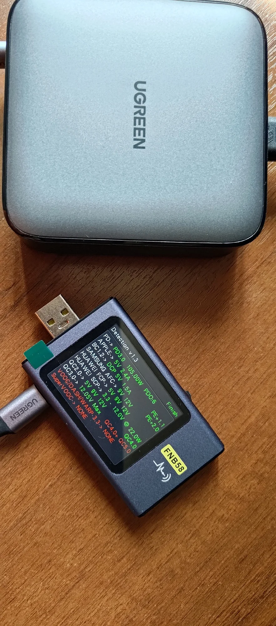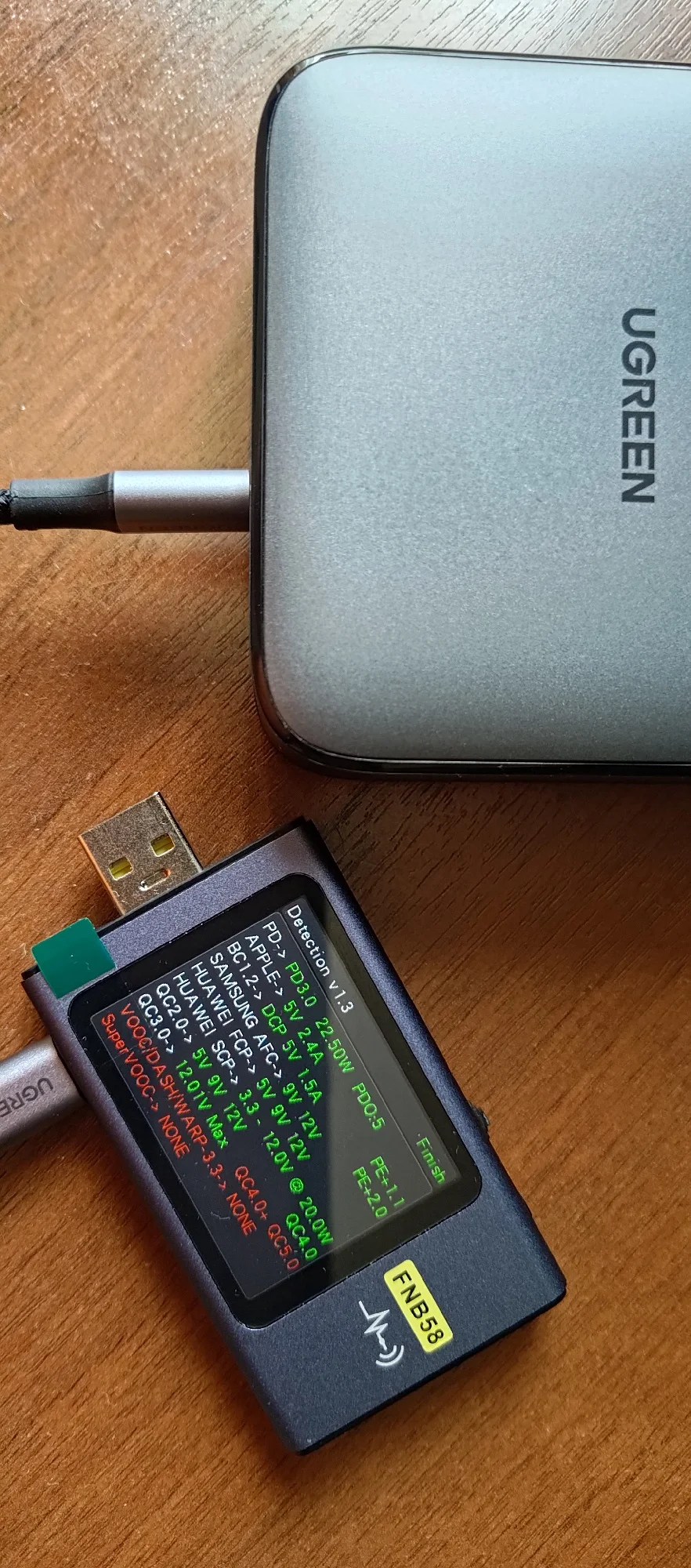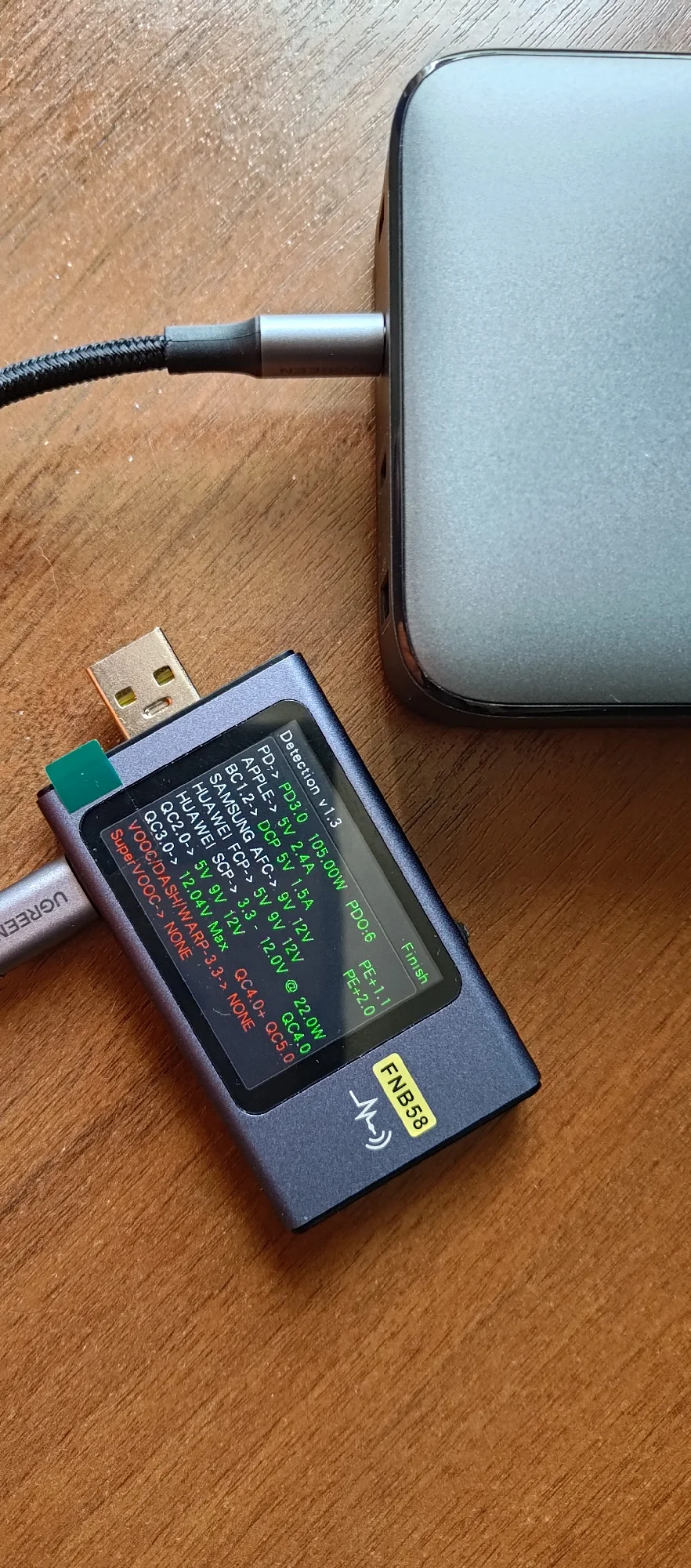 Первое ощущение: меня опять обманули. Вот просто на обложке написано 65Вт. Вот и цена низкая. Т.е., полная мощность 100Вт. Но на порт максимум 65Вт - первые два порта. На остальные 35Вт Но в этом кроется главный плюс. Блоки питания независимые. Т.е. если слева нагрузка 65Вт, справа подключаем любую нагрузку - нет согласования. Просто включается питание. Это очень круто! Т.е. слева можно мини ПК подключить, а справа остальное заряжать и питание мини ПК не прерывается! Два фото тестера - с разными кабелями. 60Вт с обычным кабелем baseus 100w от powerbank (написано 100W), второй кабель настоящий 100Вт с e-marker - пишет 65Вт. Взял пару: домой и на работу.