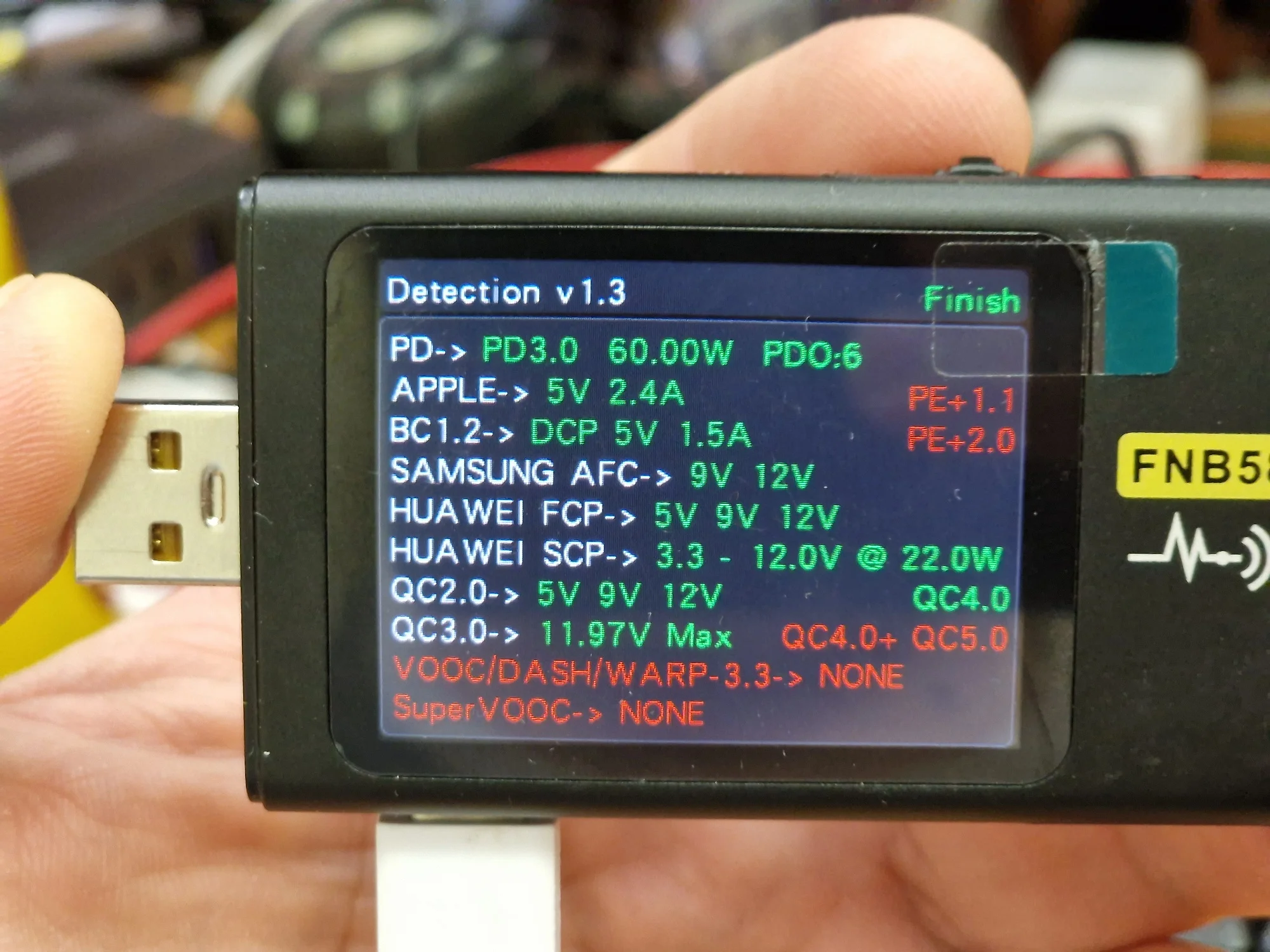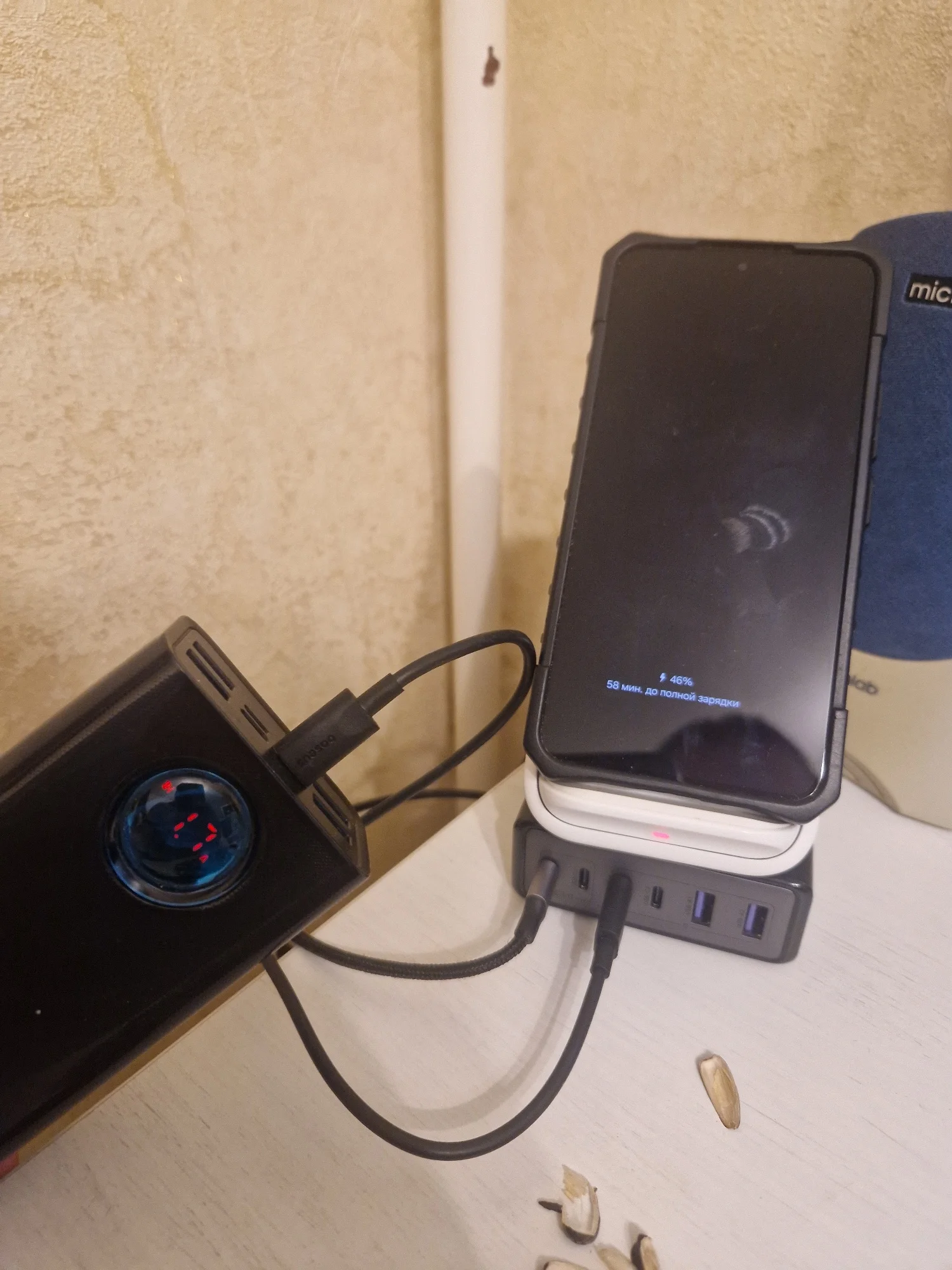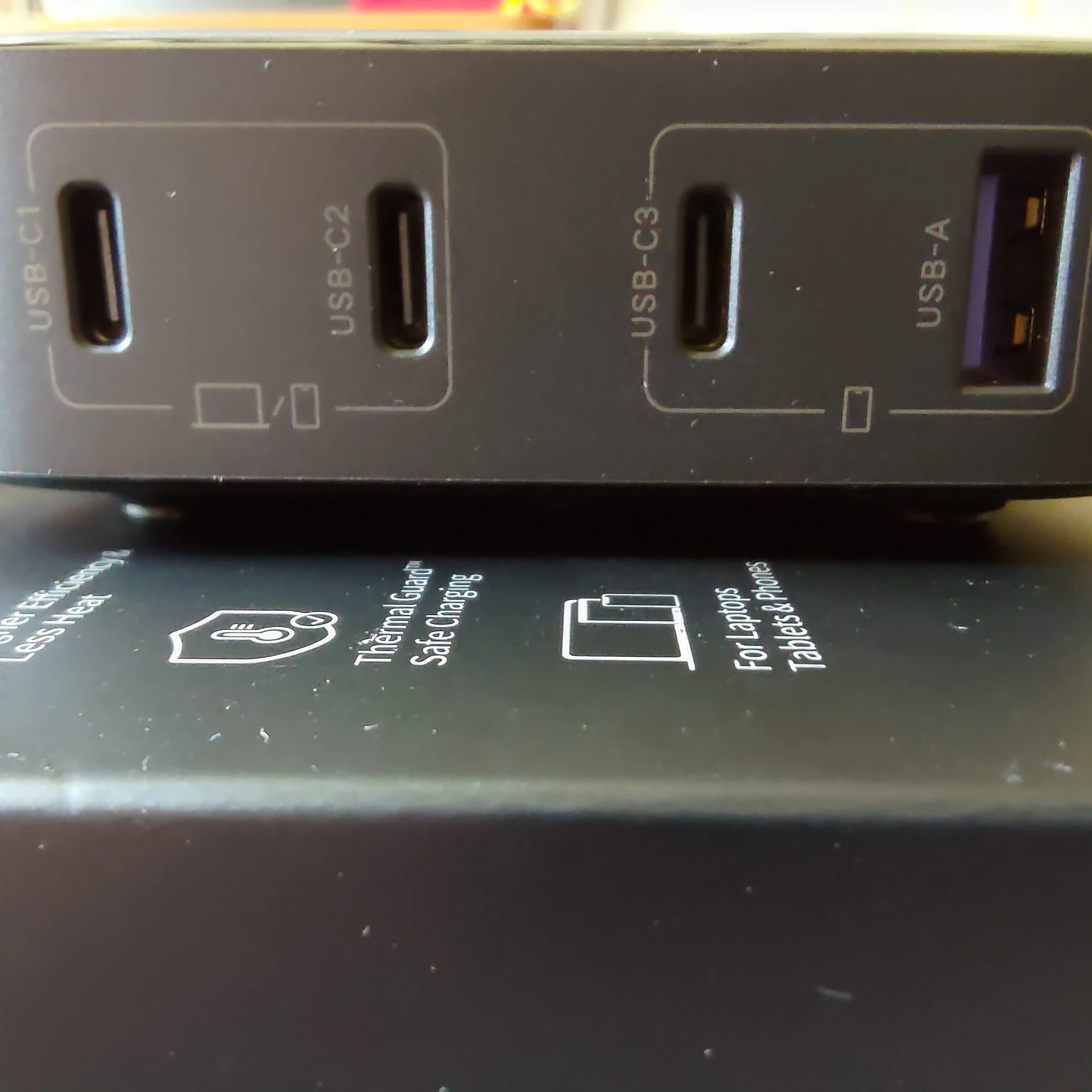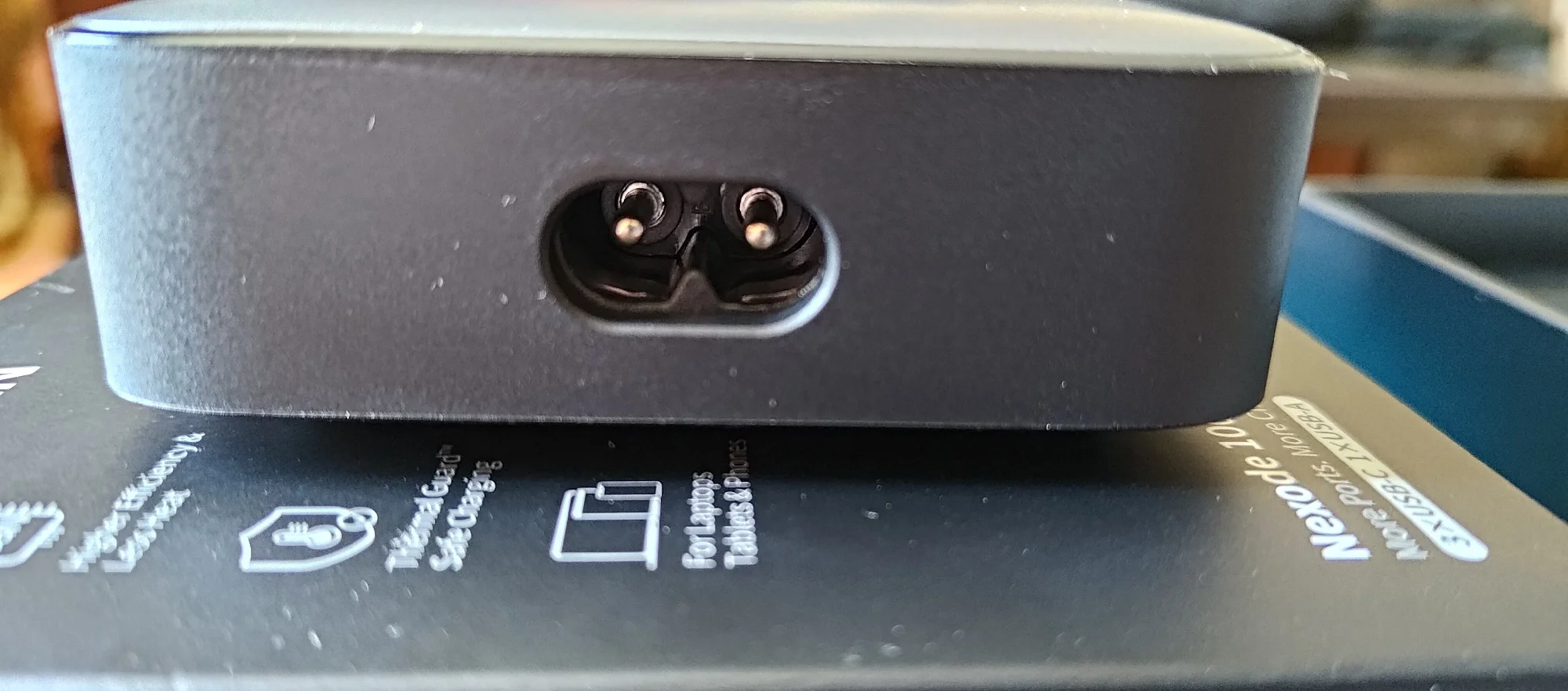 Первое ощущение: меня опять обманули. Вот просто на обложке написано 65Вт. Вот и цена низкая. Т.е., полная мощность 100Вт. Но на порт максимум 65Вт - первые два порта. На остальные 35Вт Но в этом кроется главный плюс. Блоки питания независимые. Т.е. если слева нагрузка 65Вт, справа подключаем любую нагрузку - нет согласования. Просто включается питание. Это очень круто! Т.е. слева можно мини ПК подключить, а справа остальное заряжать и питание мини ПК не прерывается! Два фото тестера - с разными кабелями. 60Вт с обычным кабелем baseus 100w от powerbank (написано 100W), второй кабель настоящий 100Вт с e-marker - пишет 65Вт. Взял пару: домой и на работу.