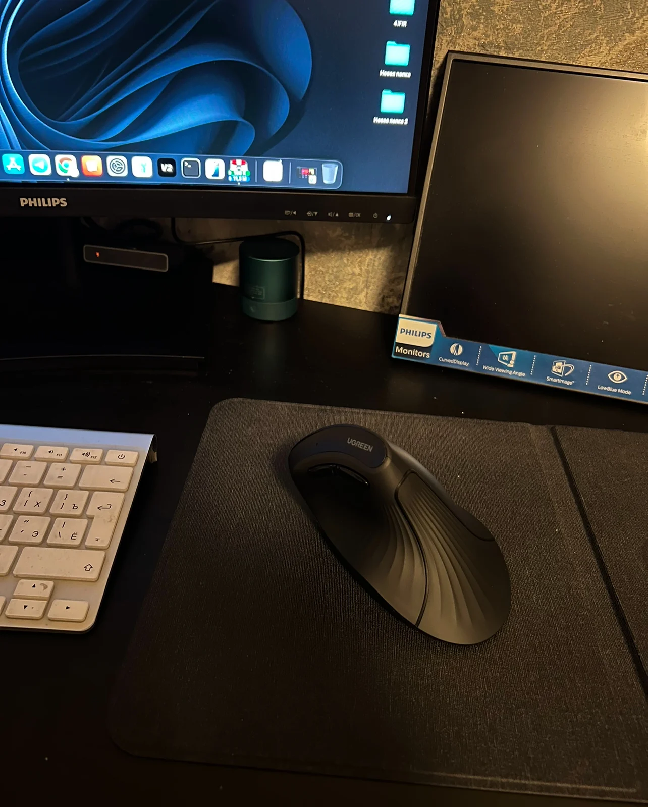 На фото сравнение мыши UGREEN и мыши Microsoft Sculpt. Размеры руки так же можно увидеть на фото. Если бы мышка была в 1,5 раза больше, то идеально по ощущениям бы легла в руку. Не хватает толщины между большим и указательным пальцам. Безымянному пальцу и мизинцу не хватает места, приходится подгибать, но это не плохо, т.к. подогнутым удобнее, но непревычне. Мышь свободно двигается по кофрику, руке удобно, напряжения нет, вся рука лежит на мышке Особенно порадовали очень тихие клавиши, их практически не слышно. Подключил к одному ПК через адаптер, к другому через bluetooth, кнопкой на мышке переключаюсь между устройствами и это просто супер. Пластик на ощупь приятный, но для потных ладоней будет не очень, т.к. вся ладонь прилегает к мышке. Пропущенных кликов нет, позиционирование точное, хорошее. DPI переключается, работает отлично. Проверено под ОС Windows. Кнопки слева листают страницы браузера вперед/назад. Заводская упаковка хорошая, напоминает Xiaomi, заклеена фирменным наклейами. Товар абсолютно новый. Прибыла быстро, без повреждений.