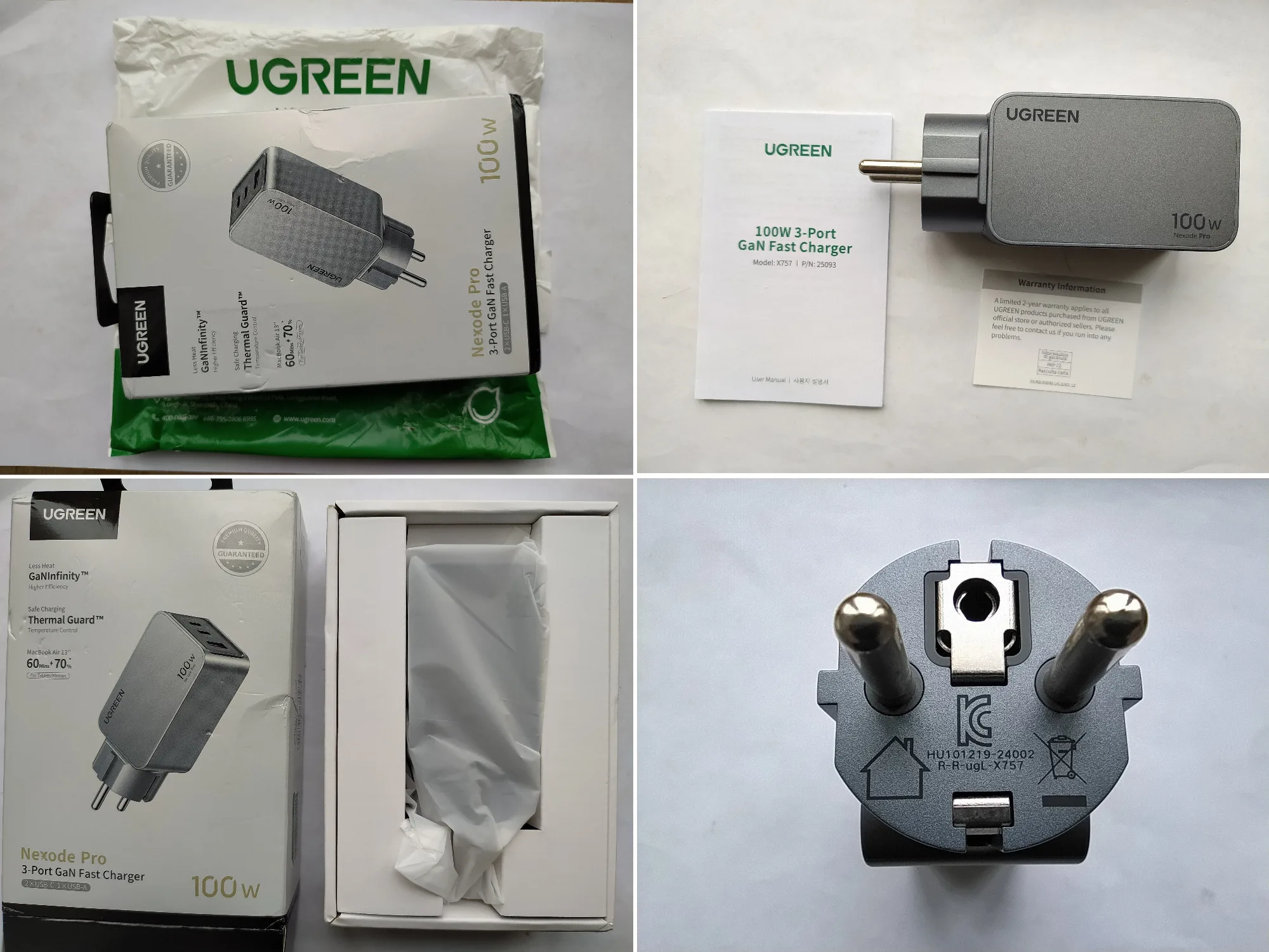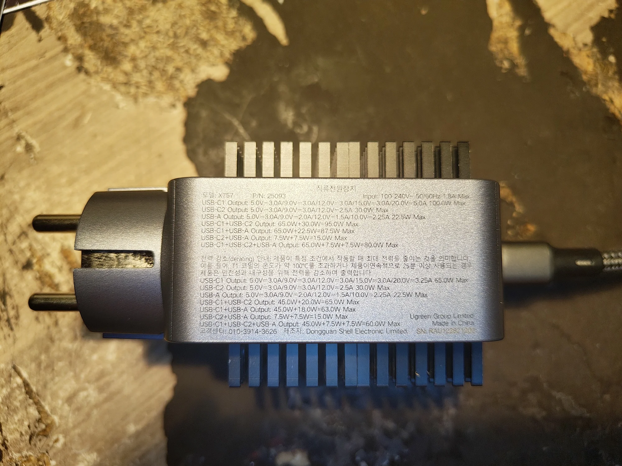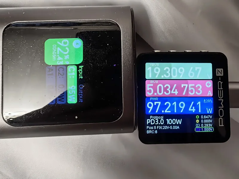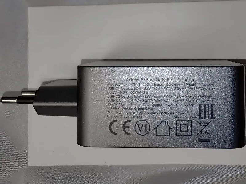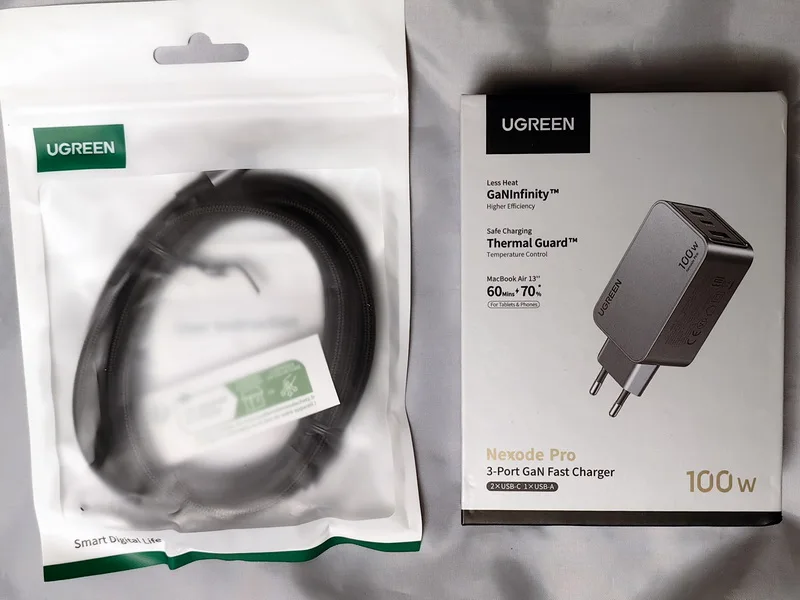 Зарядное устройство UGREEN 100W в KR-версии поставляется с европейской вилкой, оснащённой заземлением. Это обеспечивает более надёжную фиксацию в розетке по сравнению с EU-версией, особенно при горизонтальном расположении розетки (учитывая то, что зарядка из-за металлического корпуса достаточно тяжёлая для своего размера). Заземление также снижает вероятность статического напряжения, что убирает недостаток с частично работающим тачпадом при зарядке от устройств без заземления и снижение риска получить разряд при прикосновении к металлическому корпусу ноутбука (если он не из пластика). Производительность Зарядка справляется с питанием ноутбука Lenovo Xiaoxin 14 Pro 2024 (Ryzen 7 8845H) даже при нагрузке, заменяя штатное устройство. Также она заряжает повербанк Ugreen Nexode 200W 25Ah (90 Втч) на мощности около 65 Вт, что соответствует максимуму для этого повербанка. Поддерживаемые и неподдерживаемые протоколы Поддерживает: - PD3.0 - QC4.0+ и QC3.0 - PPS - SCP (Huawei) - AFC (Samsung) - BC1.2 Не поддерживает: - VOOC/Dash Charge (Oppo, Realme, OnePlus) - Dart Charge (Смартфон Vivo) - Xiaomi Fast Charge Это делает зарядку совместимой с большинством современных устройств, но для смартфонов с проприетарными технологиями скорость зарядки будет ограничена стандартными значениями, с зарядкой Nothing Phone (2) по PPS справляется отлично. Для уменьшения нагрева можно установить алюминиевые радиаторы (например, 28*28*11 мм) с термоскотчем. Это необязательно для повседневного использования, но (крайне рекомендуется и) может быть полезно при длительных высоких нагрузках (к примеру в играх). Цена на момент покупки составила около ~2667 ₽, доставка заняла 11 дней до Москвы.