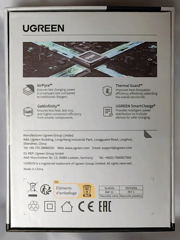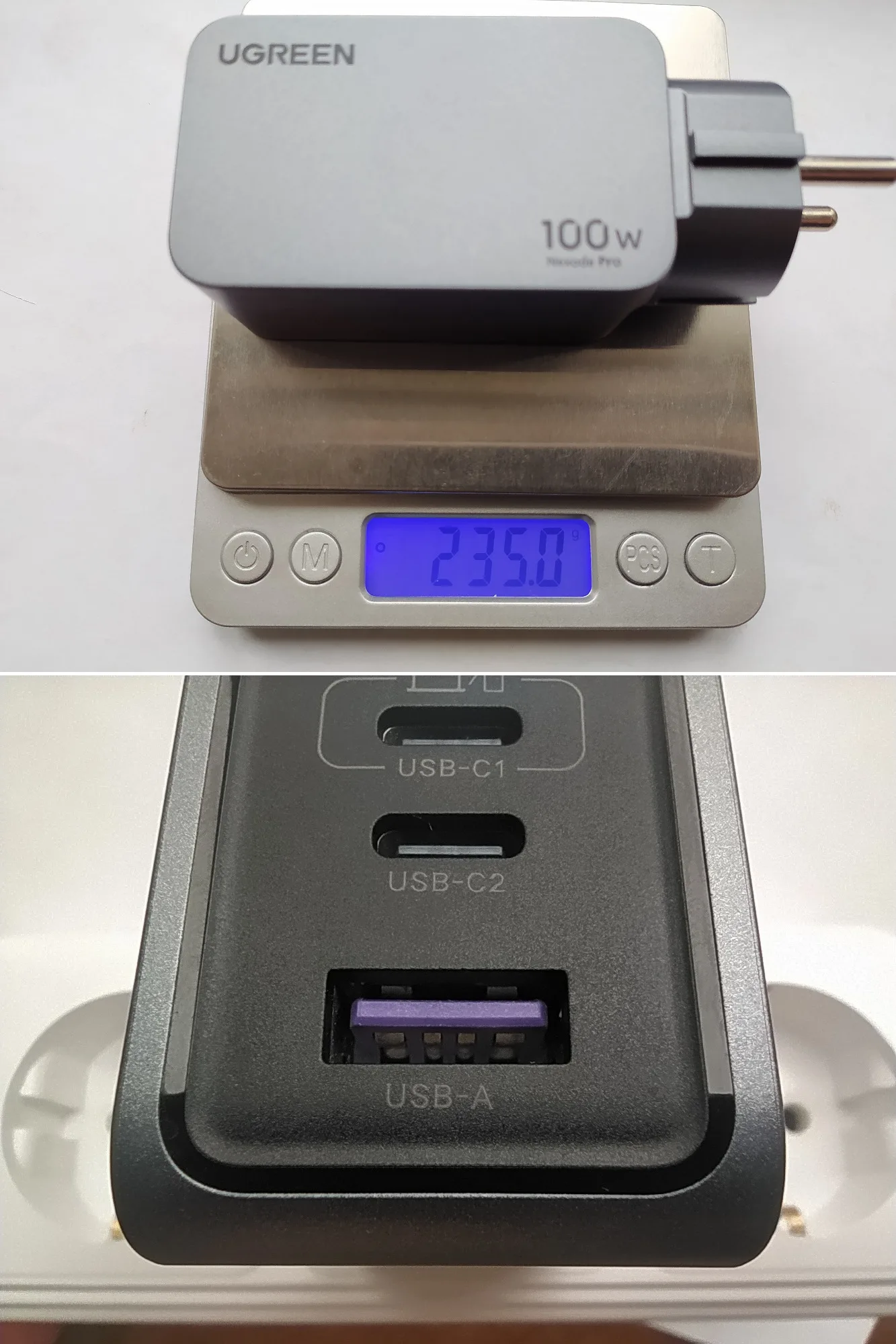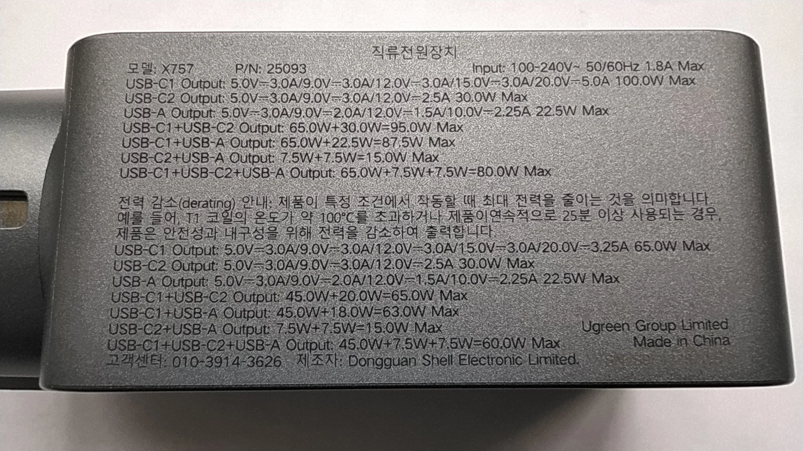 Зарядное устройство UGREEN 100W в KR-версии поставляется с европейской вилкой, оснащённой заземлением. Это обеспечивает более надёжную фиксацию в розетке по сравнению с EU-версией, особенно при горизонтальном расположении розетки (учитывая то, что зарядка из-за металлического корпуса достаточно тяжёлая для своего размера). Заземление также снижает вероятность статического напряжения, что убирает недостаток с частично работающим тачпадом при зарядке от устройств без заземления и снижение риска получить разряд при прикосновении к металлическому корпусу ноутбука (если он не из пластика). Производительность Зарядка справляется с питанием ноутбука Lenovo Xiaoxin 14 Pro 2024 (Ryzen 7 8845H) даже при нагрузке, заменяя штатное устройство. Также она заряжает повербанк Ugreen Nexode 200W 25Ah (90 Втч) на мощности около 65 Вт, что соответствует максимуму для этого повербанка. Поддерживаемые и неподдерживаемые протоколы Поддерживает: - PD3.0 - QC4.0+ и QC3.0 - PPS - SCP (Huawei) - AFC (Samsung) - BC1.2 Не поддерживает: - VOOC/Dash Charge (Oppo, Realme, OnePlus) - Dart Charge (Смартфон Vivo) - Xiaomi Fast Charge Это делает зарядку совместимой с большинством современных устройств, но для смартфонов с проприетарными технологиями скорость зарядки будет ограничена стандартными значениями, с зарядкой Nothing Phone (2) по PPS справляется отлично. Для уменьшения нагрева можно установить алюминиевые радиаторы (например, 28*28*11 мм) с термоскотчем. Это необязательно для повседневного использования, но (крайне рекомендуется и) может быть полезно при длительных высоких нагрузках (к примеру в играх). Цена на момент покупки составила около ~2667 ₽, доставка заняла 11 дней до Москвы.