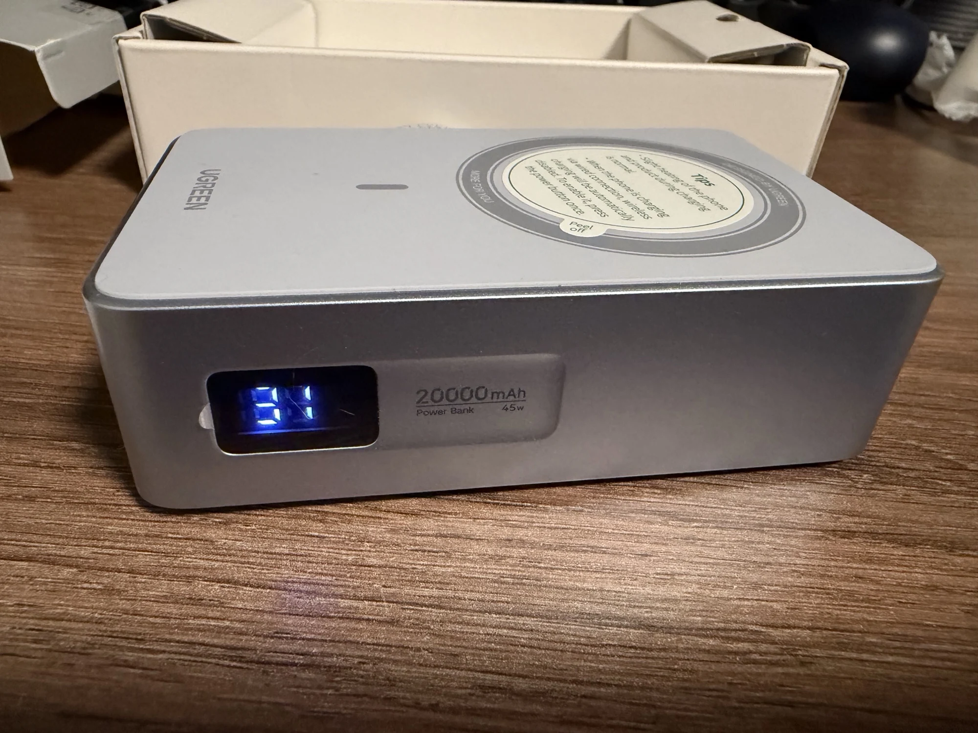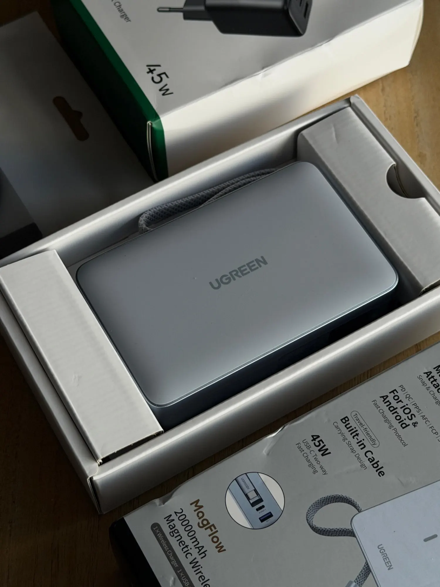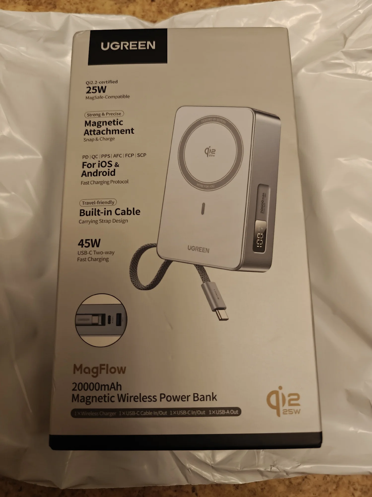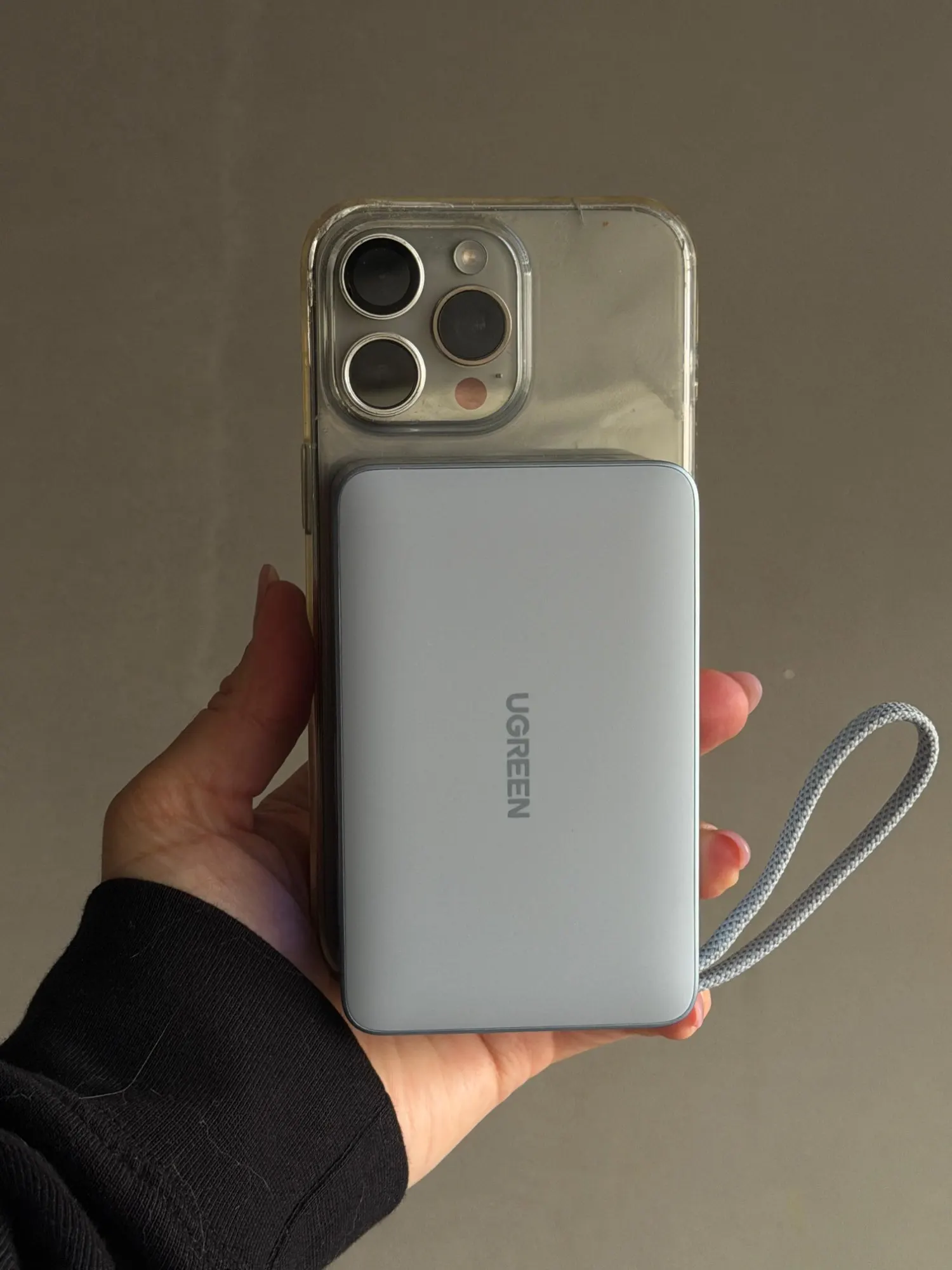 Очень классный пауэрбанк! В руках ощущается как премиум устройство. Кнопка включения активирует дисплей на котором отображается остаток заряда в батарее. Со стороны магнита покрытие софттач, точно не будет царапать корпус смартфона. Купил на 20000 mAh чтобы сравнить с таким же только на 10000 mAh. Разница только в толщине, а в остальном всё отлично. И тут толщина играет ещё роль держателя подставки для смартфона. Так как имея такую толщину смартфон можно ставить и в книжном, и в альбомном варианте. И да, я использую его с iPhone 17 Pro max. У спургуи используется с тонким поуэрбанком, а я с толстым, так как я езжу в командировки и в дороге иногда нахожусь несколько дней. В общем все эти поуэрбанки от Ugreen просто супер. Рекомендую👍