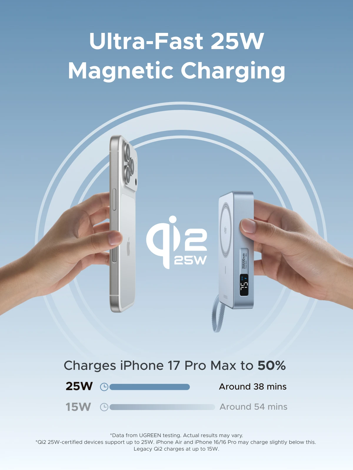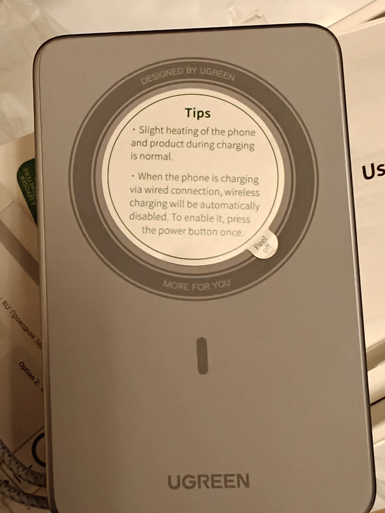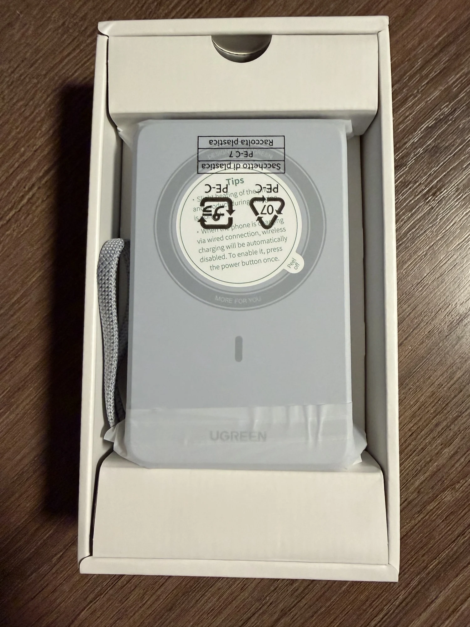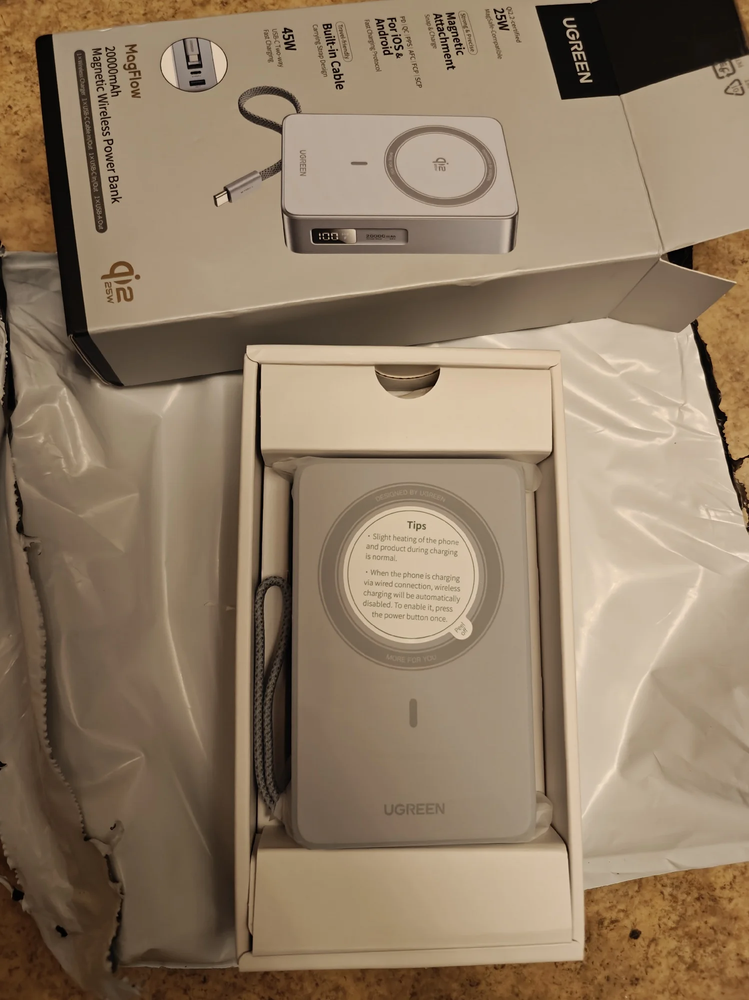 Очень классный пауэрбанк! В руках ощущается как премиум устройство. Кнопка включения активирует дисплей на котором отображается остаток заряда в батарее. Со стороны магнита покрытие софттач, точно не будет царапать корпус смартфона. Купил на 20000 mAh чтобы сравнить с таким же только на 10000 mAh. Разница только в толщине, а в остальном всё отлично. И тут толщина играет ещё роль держателя подставки для смартфона. Так как имея такую толщину смартфон можно ставить и в книжном, и в альбомном варианте. И да, я использую его с iPhone 17 Pro max. У спургуи используется с тонким поуэрбанком, а я с толстым, так как я езжу в командировки и в дороге иногда нахожусь несколько дней. В общем все эти поуэрбанки от Ugreen просто супер. Рекомендую👍