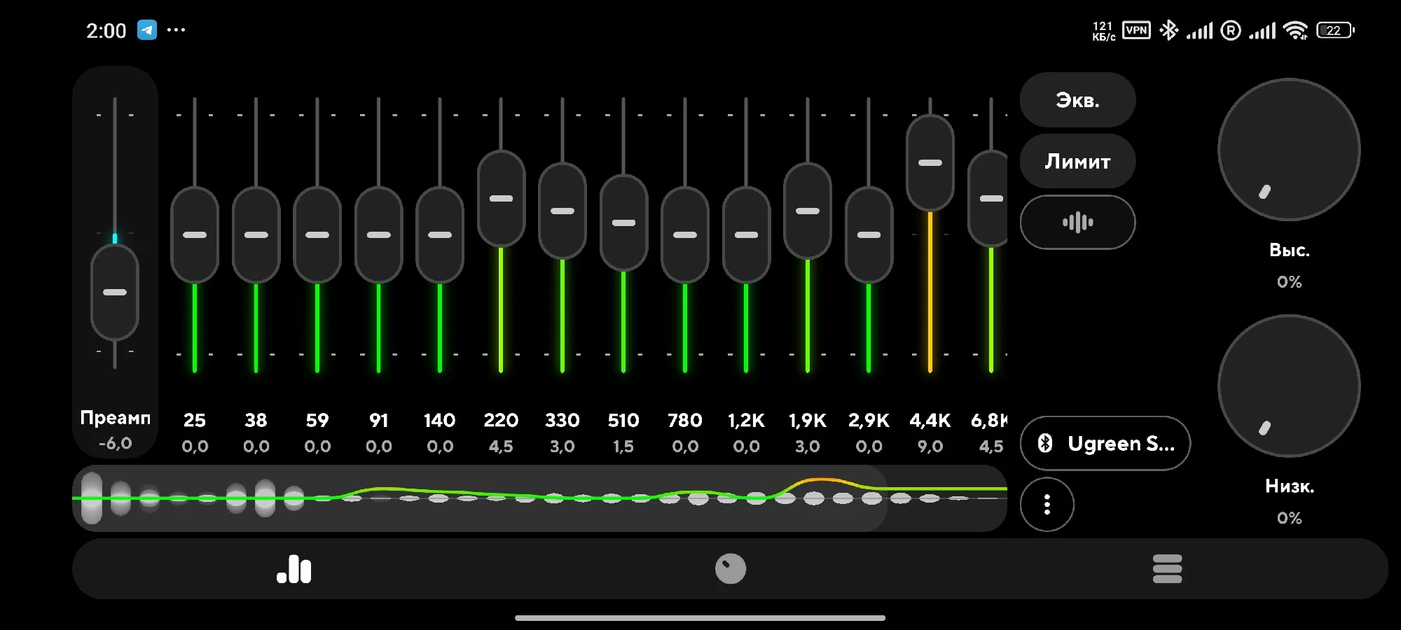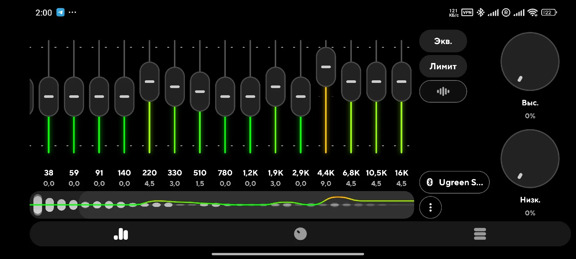 Ну что сказать, за свои деньги наушники хорошие. После Max5c ВАУ-эффект точно дадут за счёт увеличения сцены. Чем дольше находятся на голове, тем меньше чувствуются, разве что уши потеют в квартире 27°C. По звучанию имеют провалы в области 200...800 Гц и в районе 4 кГц, где-то это я уже слышал, и да - Technics EAH-A800 звучат очень похожим образом по сцене и тонально. Прикладываю настройку эквалайзера, сделанную на скорую руку. Также сравнение пресетов "Classic" с остальными по порядку, "Jazz" и такд далее до "Treble". Шумодав влияет на звук. Чем сильнее уровень, тем больше добавляется бас. Режим прозрачности на звук не влияет. Тест микрофонов: ищите на YT "Тест микрофонов Ugreen: Studio Pro vs. Max 5c и другие"