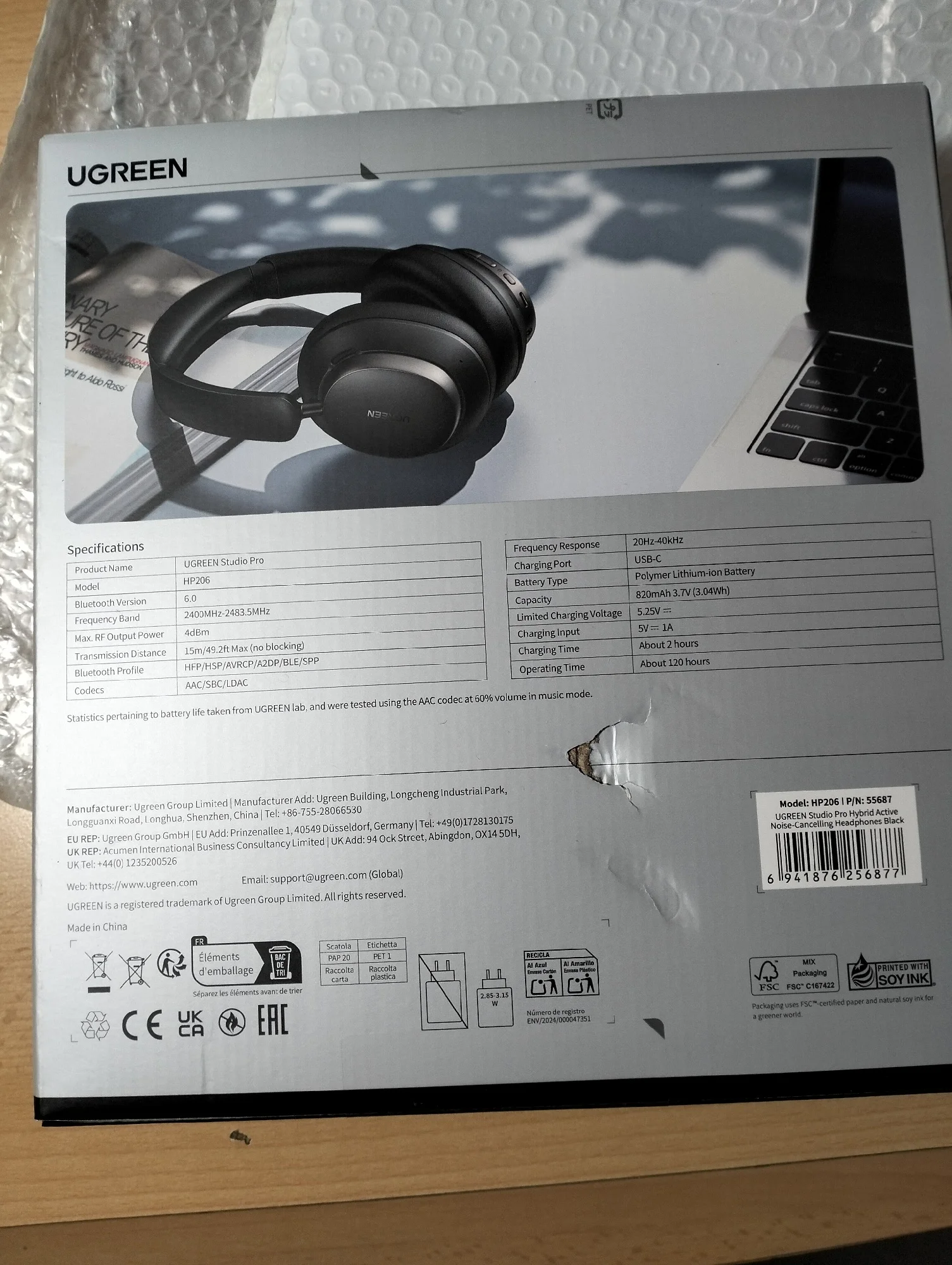 Доставлено за 5 дней до МО, экспрессом. Ну что можно сказать, Ugreen после Max 5 исправили многие ошибки, громкость в Studio Pro побольше, по кабелю нет высоких частот, басов дофига)))по Bluetooth наконец то появились высокие частоты, из за второго динамика, средние тоже появились, но все равно звук сразу стал лучше намного, чем в Max 5 комплектация идентичная, провод 3.5 в Studio Pro гораздо толще, посадка понравилась больше в Max 5 наверно из за того, что они полегче, в остальном Max 5 хуже, в Studio Pro расширилась сцена, батарейку нарастили, оголовье теперь из металла, по первой наверно с головы будут слетать у вас, кнопки стали гораздо лучше, включаются они гораздо быстрее, очень много плюсов на самом деле, для обычного пользователя разница будет существенная по сравнению с прошлой моделью, Ugreen проделали отличную работу, по скидкам обошлись они в 2600 рублей, что считаю отличной ценой за данные наушники! Max 5 я брал за 3400 и они просто лежали два года я их даже не носил, из за низкой громкости ее было недостаточно, в Studio Pro они ее конечно подтянули, но ещё бы чуть чуть, и прям будет идеально, а так работа проделана колоссальная, я доволен покупкой, спасибо большое! Рекомендую:) P:S по поводу чашек, через сколько они заскрипят время покажет, будем пользоваться прогревать их, обязательно устанавливаете приложение Ugreen Home для полного раскрытия наушников, и включения режима LDAC изначально они работают на AAC/SBC если вы на Андроиде. Они тяжелее Max 5 тоже имейте это пожалуйста ввиду, фууух вроде бы все дописал, всем хорошей музыки, и качественного звучания))