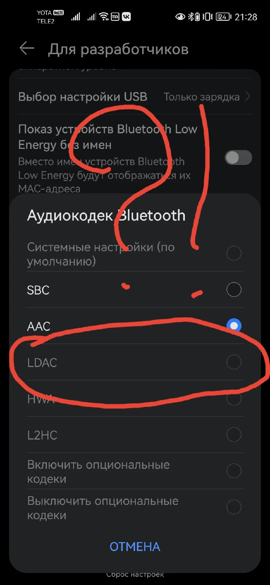 Нет в них никакого кодека ldac !!! звук, как из ведра, под водой. такое ощущение, что отъигрывают от 100-120 герц, до килогерц 10-12 потом затихают. нет качества, от слова совсем, слушал разные форматы, в том числе и студийные записи... ...не музыка, а какая-то пытка акустическая. с ними доступны только sbc и aac кодеки, самые простые наушники по факту. даже aptx не прикрутили🙄 тьфу, говно! не стоят они трёх тысяч рублей! за те же деньги, можно купить SOUNDPEATS, в которых ЕСТЬ ldac!!! поверьте, качество земля и небо! выброшенные деньги!