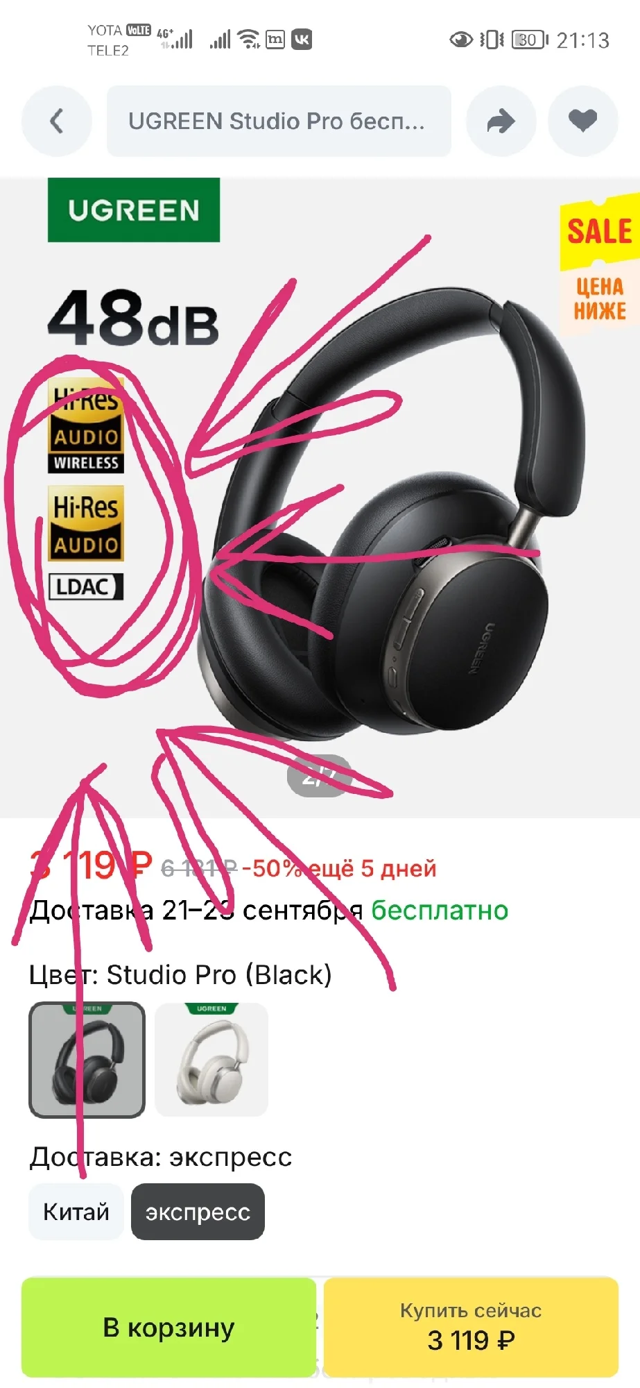 Доставлено за 5 дней до МО, экспрессом. Ну что можно сказать, Ugreen после Max 5 исправили многие ошибки, громкость в Studio Pro побольше, по кабелю нет высоких частот, басов дофига)))по Bluetooth наконец то появились высокие частоты, из за второго динамика, средние тоже появились, но все равно звук сразу стал лучше намного, чем в Max 5 комплектация идентичная, провод 3.5 в Studio Pro гораздо толще, посадка понравилась больше в Max 5 наверно из за того, что они полегче, в остальном Max 5 хуже, в Studio Pro расширилась сцена, батарейку нарастили, оголовье теперь из металла, по первой наверно с головы будут слетать у вас, кнопки стали гораздо лучше, включаются они гораздо быстрее, очень много плюсов на самом деле, для обычного пользователя разница будет существенная по сравнению с прошлой моделью, Ugreen проделали отличную работу, по скидкам обошлись они в 2600 рублей, что считаю отличной ценой за данные наушники! Max 5 я брал за 3400 и они просто лежали два года я их даже не носил, из за низкой громкости ее было недостаточно, в Studio Pro они ее конечно подтянули, но ещё бы чуть чуть, и прям будет идеально, а так работа проделана колоссальная, я доволен покупкой, спасибо большое! Рекомендую:) P:S по поводу чашек, через сколько они заскрипят время покажет, будем пользоваться прогревать их, обязательно устанавливаете приложение Ugreen Home для полного раскрытия наушников, и включения режима LDAC изначально они работают на AAC/SBC если вы на Андроиде. Они тяжелее Max 5 тоже имейте это пожалуйста ввиду, фууух вроде бы все дописал, всем хорошей музыки, и качественного звучания))