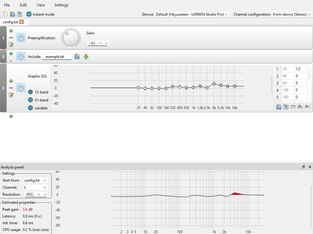 Ну что сказать, за свои деньги наушники хорошие. После Max5c ВАУ-эффект точно дадут за счёт увеличения сцены. Чем дольше находятся на голове, тем меньше чувствуются, разве что уши потеют в квартире 27°C. По звучанию имеют провалы в области 200...800 Гц и в районе 4 кГц, где-то это я уже слышал, и да - Technics EAH-A800 звучат очень похожим образом по сцене и тонально. Прикладываю настройку эквалайзера, сделанную на скорую руку. Также сравнение пресетов "Classic" с остальными по порядку, "Jazz" и такд далее до "Treble". Шумодав влияет на звук. Чем сильнее уровень, тем больше добавляется бас. Режим прозрачности на звук не влияет. Тест микрофонов: ищите на YT "Тест микрофонов Ugreen: Studio Pro vs. Max 5c и другие"
