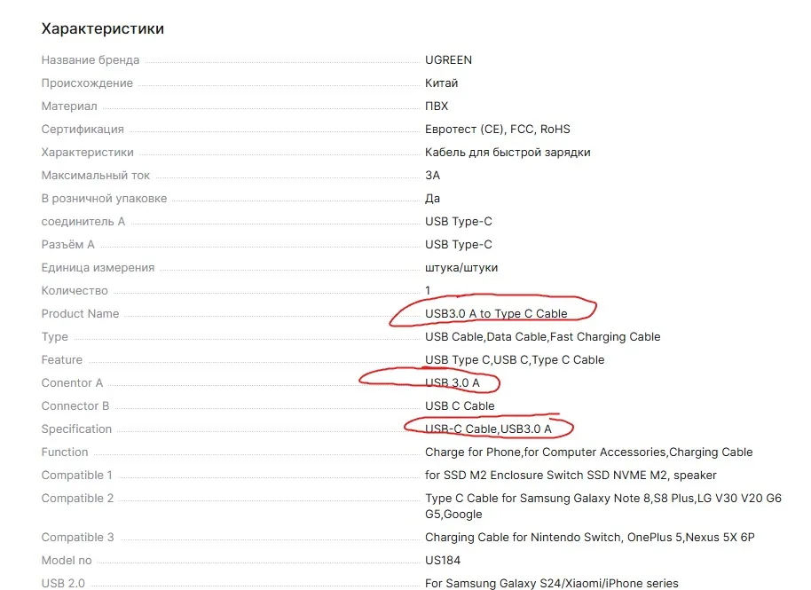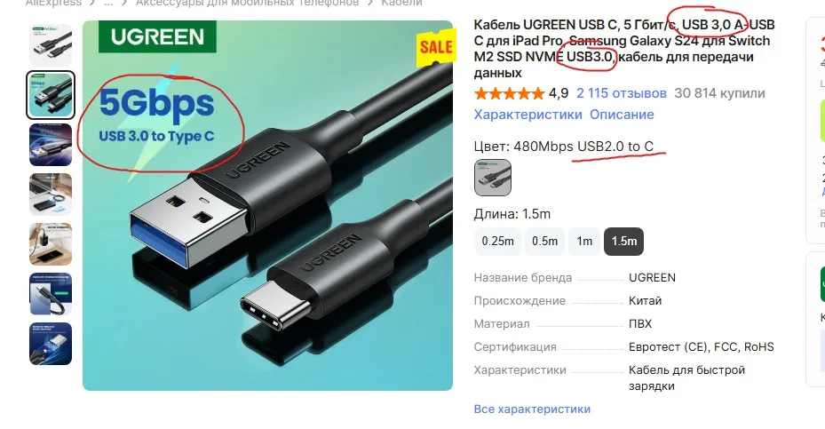 Продавец сознательно вводит в заблуждение, указывает в тексте и на фото, что кабели USB 3.0, в отзывах тоже куча фото с синими разъёмами USB 3.0, а по факту присылает старые медленные 2.0 и ссылается на малозаметную надпись что это 2.0 🤷♂️