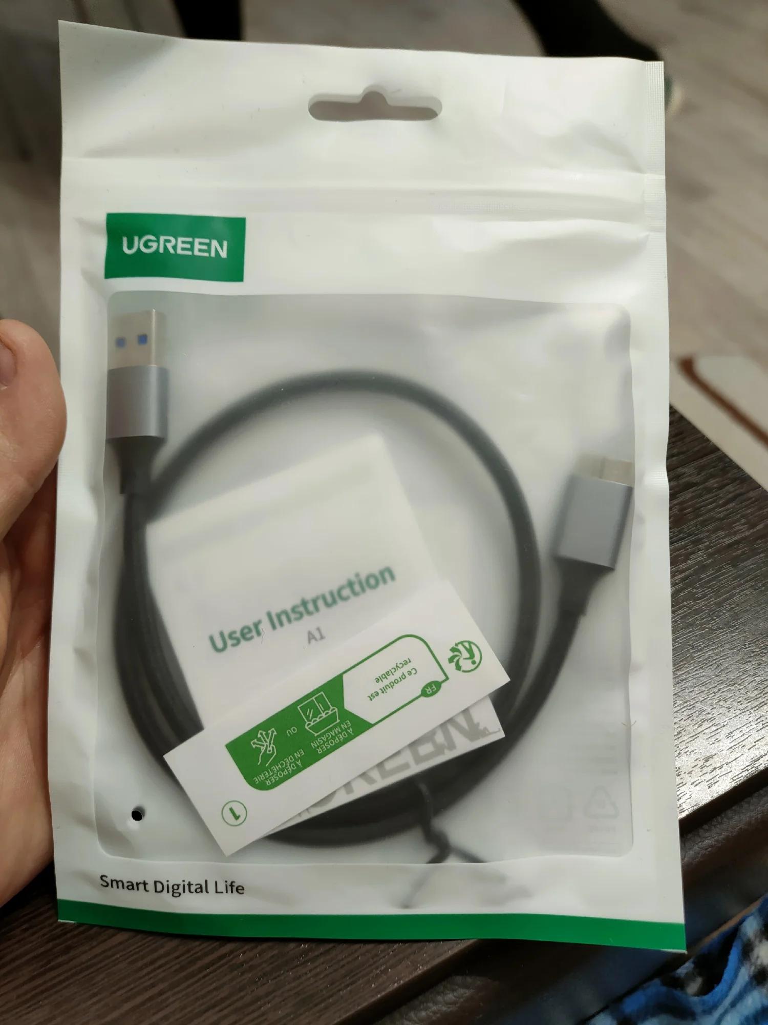 Отличный кабель! UGREEN как всегда лучшие!!! Алюминиевые коннекторы, защитная оплётка кабеля, классный дизайн... ну и как всегда суперский zip пакетик, который можно использовать для разных задач. С переходником SATA-USB работает отлично! Конечно рекомендую и продавца, и товар!!!